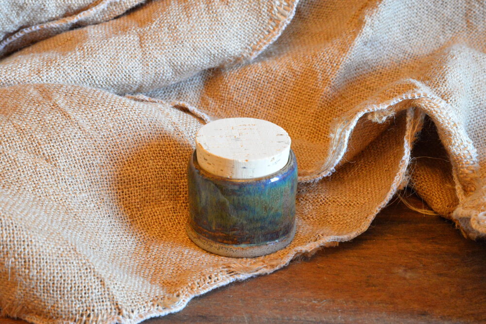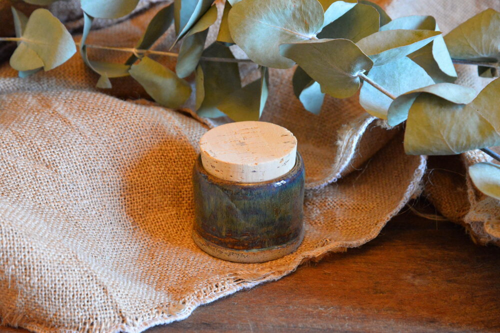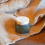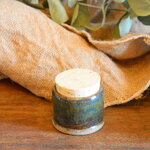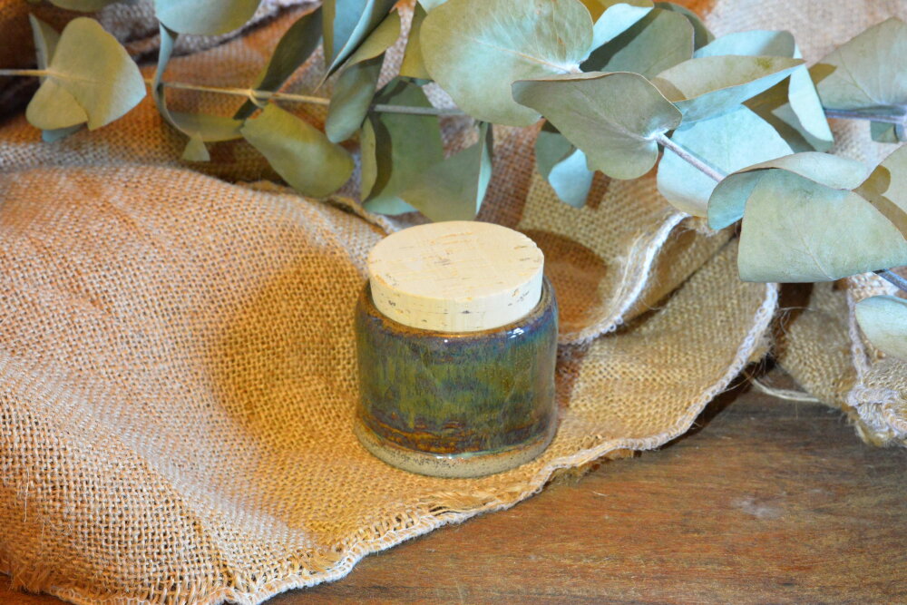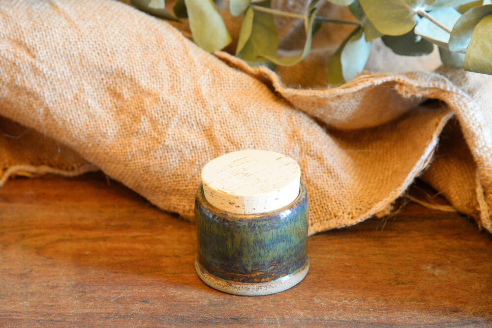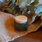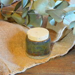 Petit pot à sel en terre grise emaillé avec une combinaison de green tea et black walnut