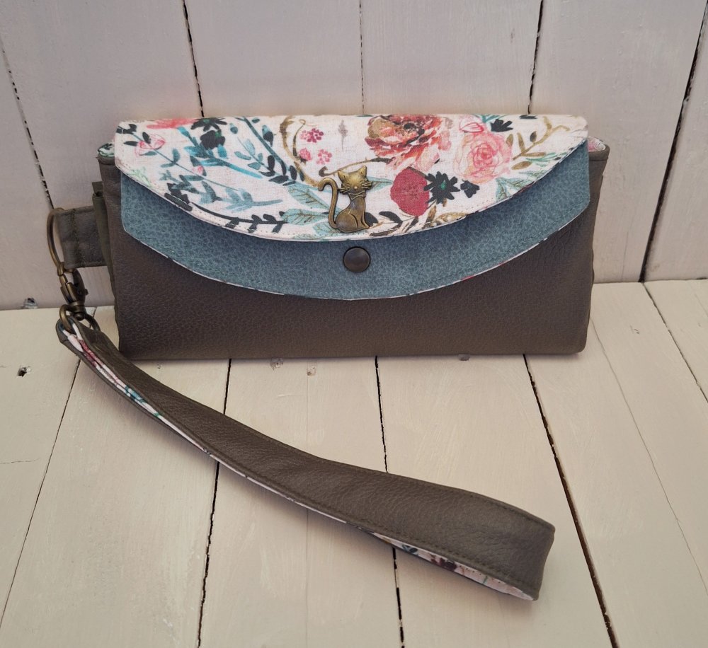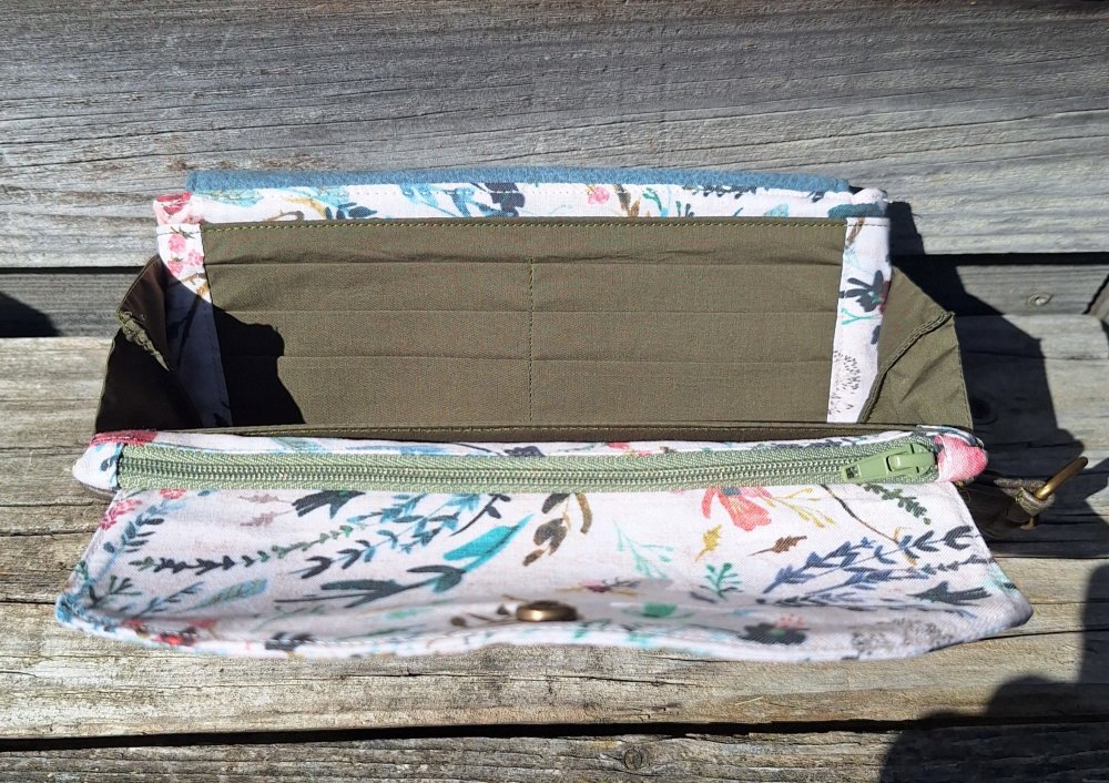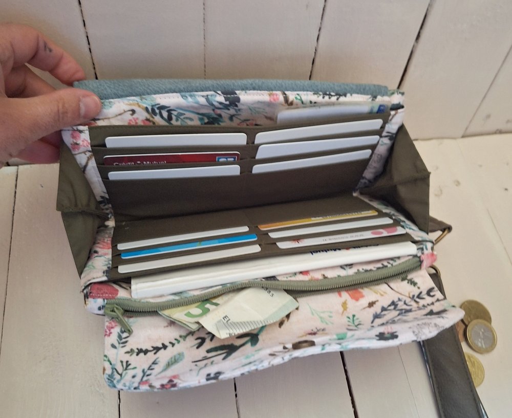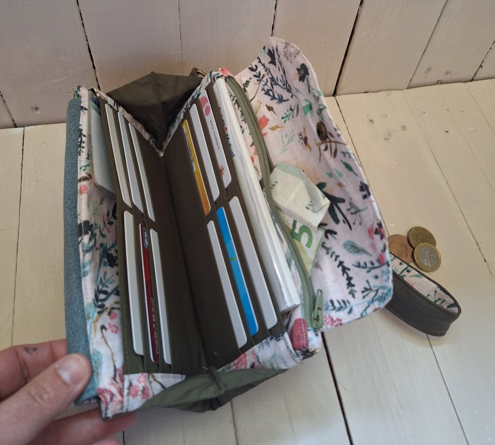 L'extérieur est en faux cuir kaki. Les rabats sont en coton blanc cassé avec des fleurs sauvages ainsi qu'en similicuir bleu. La doublure est en coton kaki. Le tissu du rabat extérieur se retrouve à l'intérieur du portefeuille.