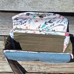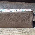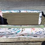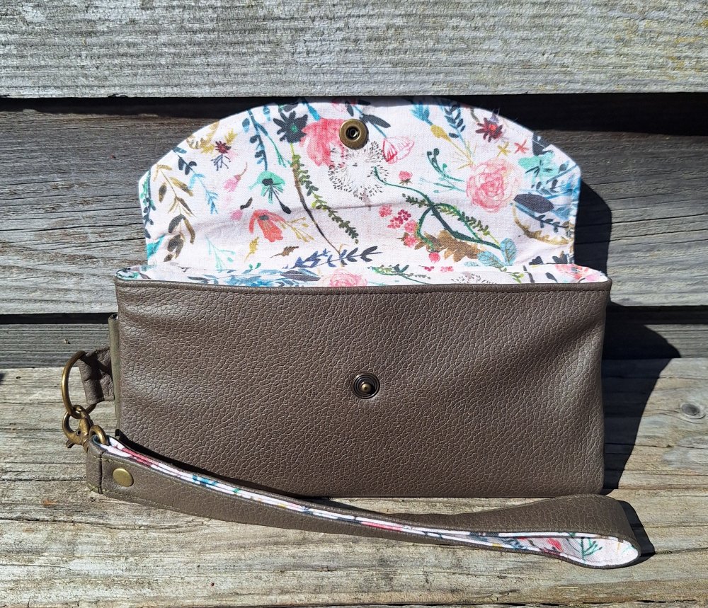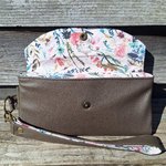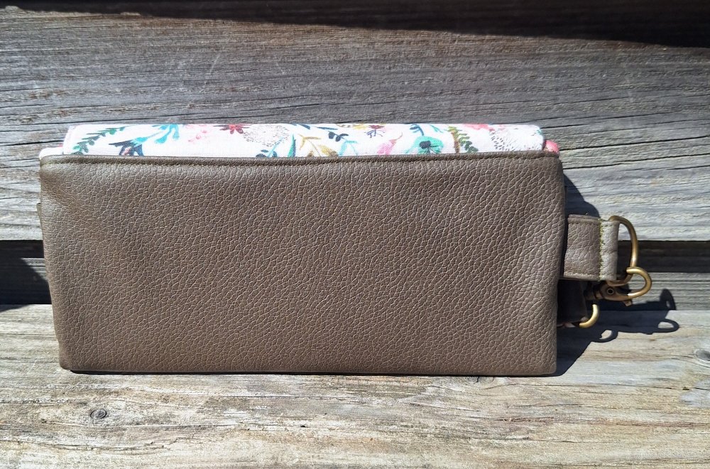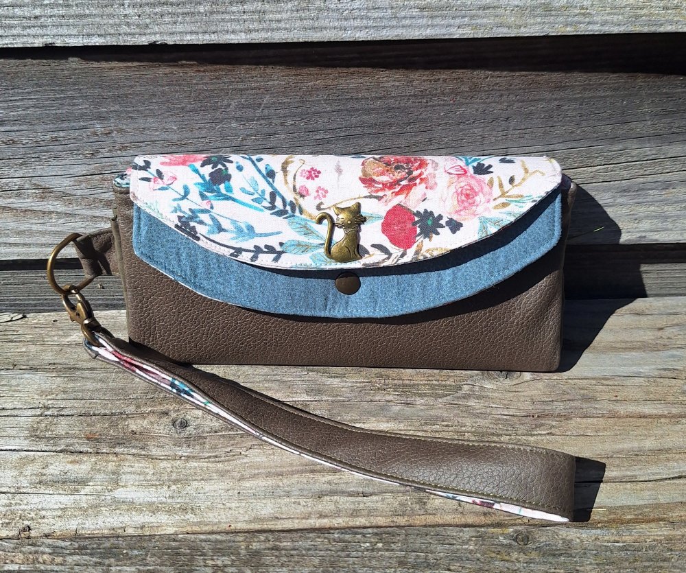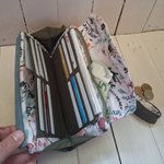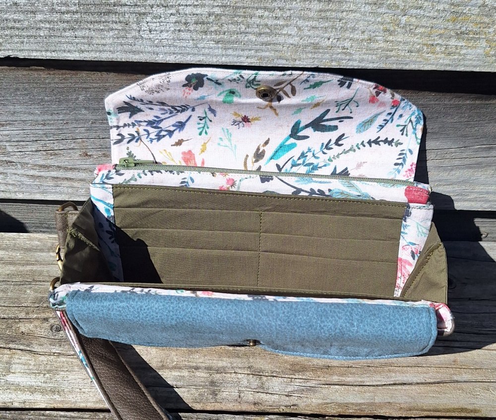 L'extérieur est en faux cuir kaki. Les rabats sont en coton blanc cassé avec des fleurs sauvages ainsi qu'en similicuir bleu. La doublure est en coton kaki. Le tissu du rabat extérieur se retrouve à l'intérieur du portefeuille.