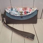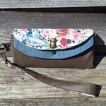 Grand portefeuille porte-chéquier femme en faux cuir kaki , tissu blanc cassé avec des fleurs sauvages et similicuir bleu, pochette clutch