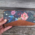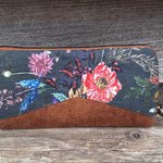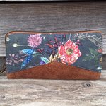 Grand portefeuille zippée femme en faux cuir camel et tissu gris fleuri et bohème , 16 porte-cartes, couleurs automnales, fabrication artisanale française