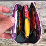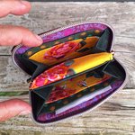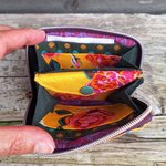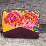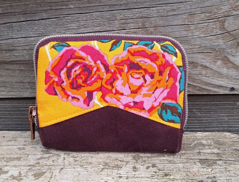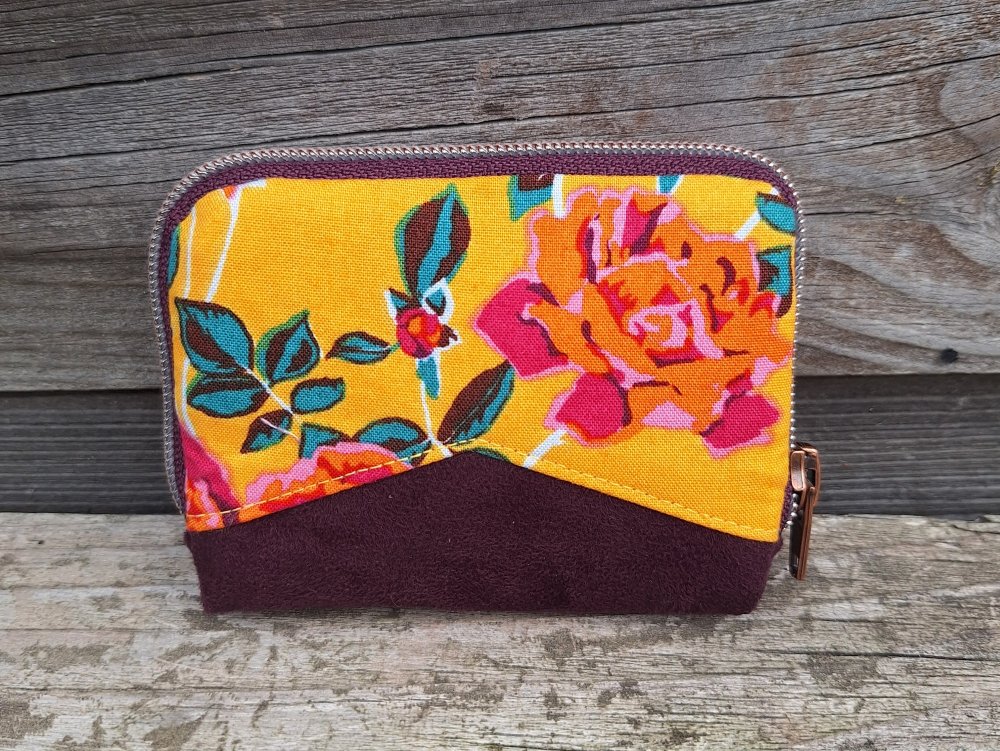 Mini portefeuille zippé pour femme en tissu jaune avec des roses, suédine aubergine, porte-cartes mignon, portefeuille minimaliste; porte-cartes élégant original et pratique
