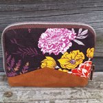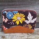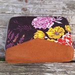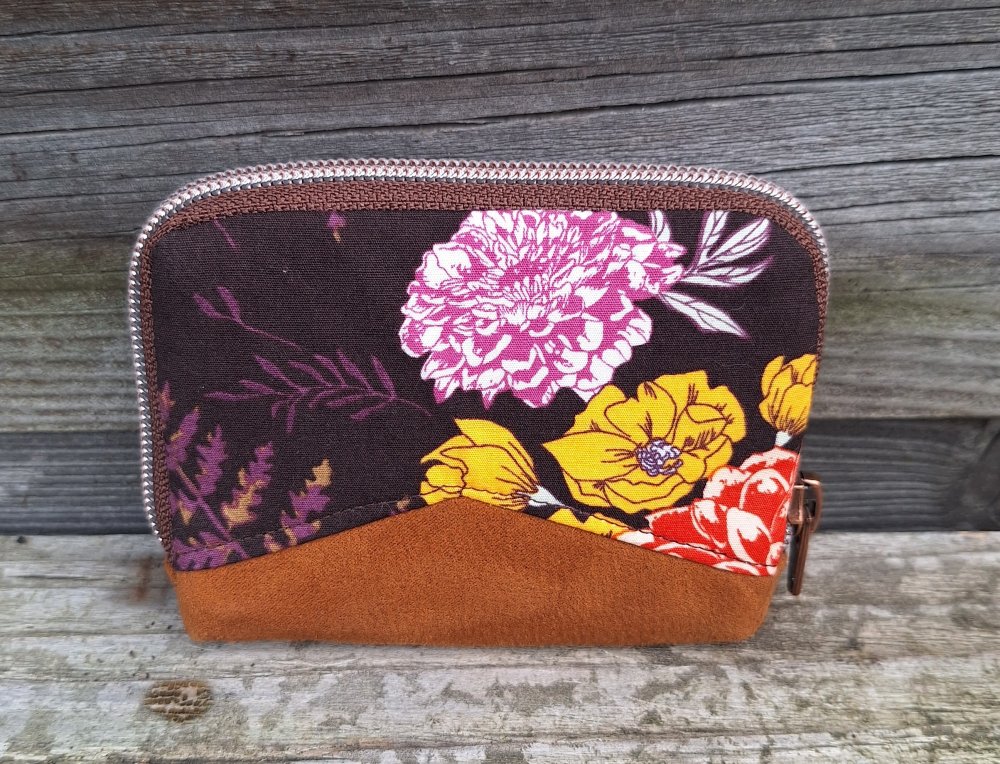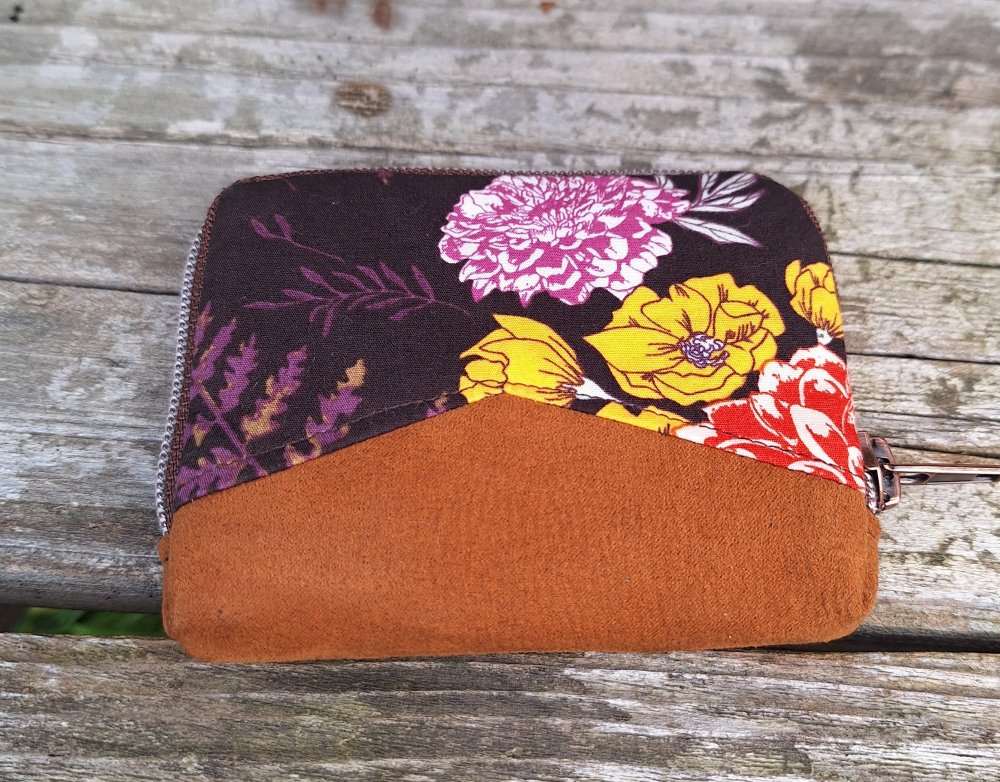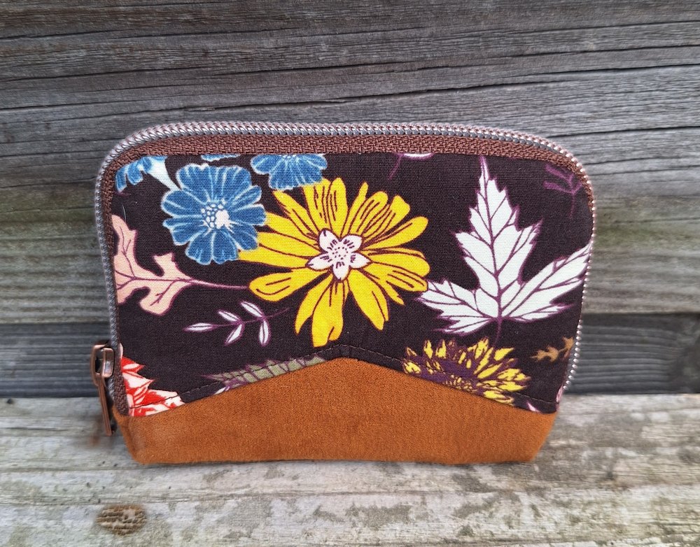 Mini portefeuille zippé pour femme aux couleurs de l'automne en tissu marron avec des fleurs et des plantes, faux cuir cuivre, porte-cartes mignon, portefeuille minimaliste; porte-cartes élégant original et pratique
