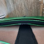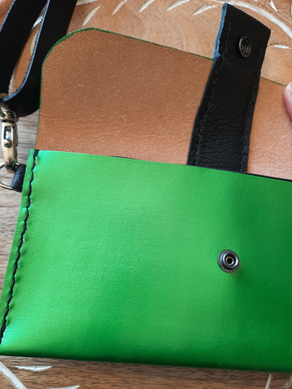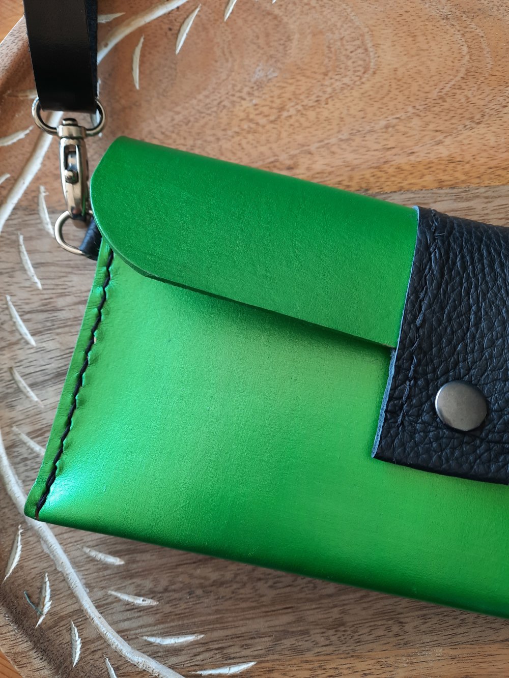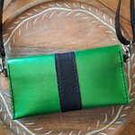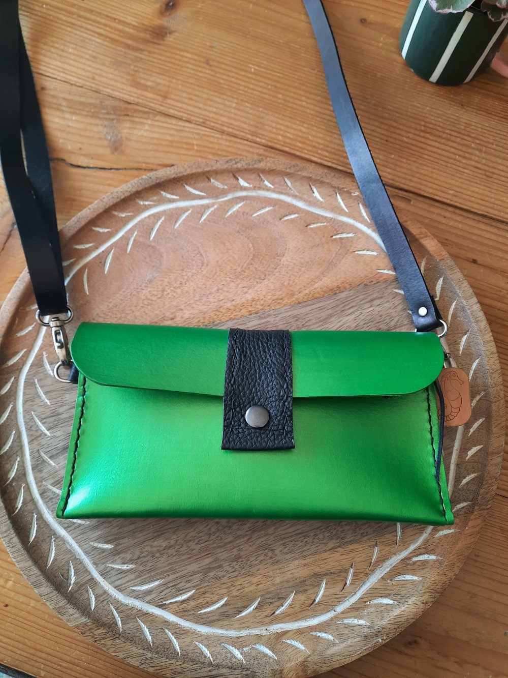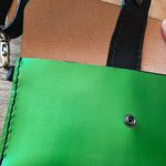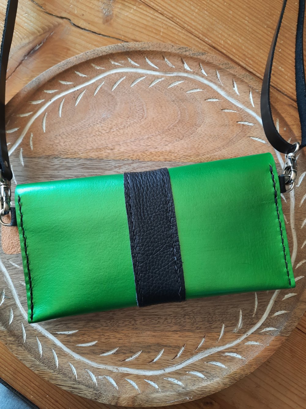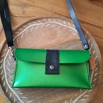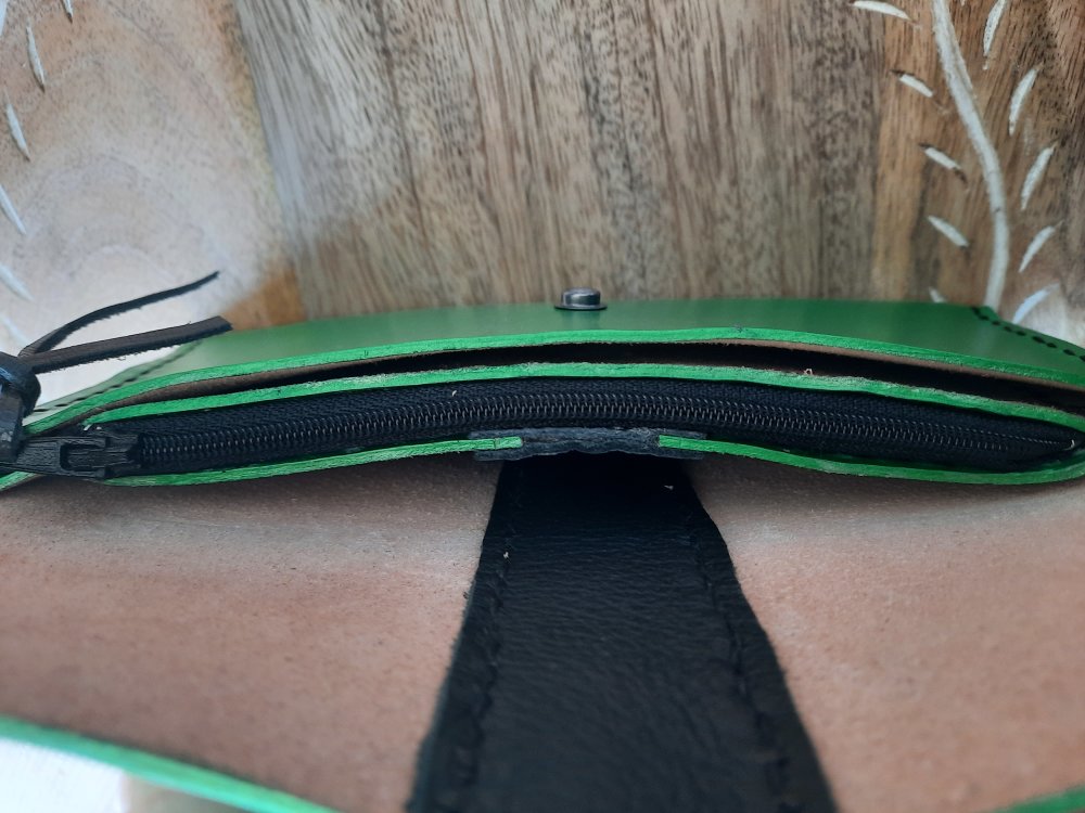 Cuir au tannage végétal, teinté vert irisé, un joli empiècement noir et les coutures noires, en font une pièce incontournable.
