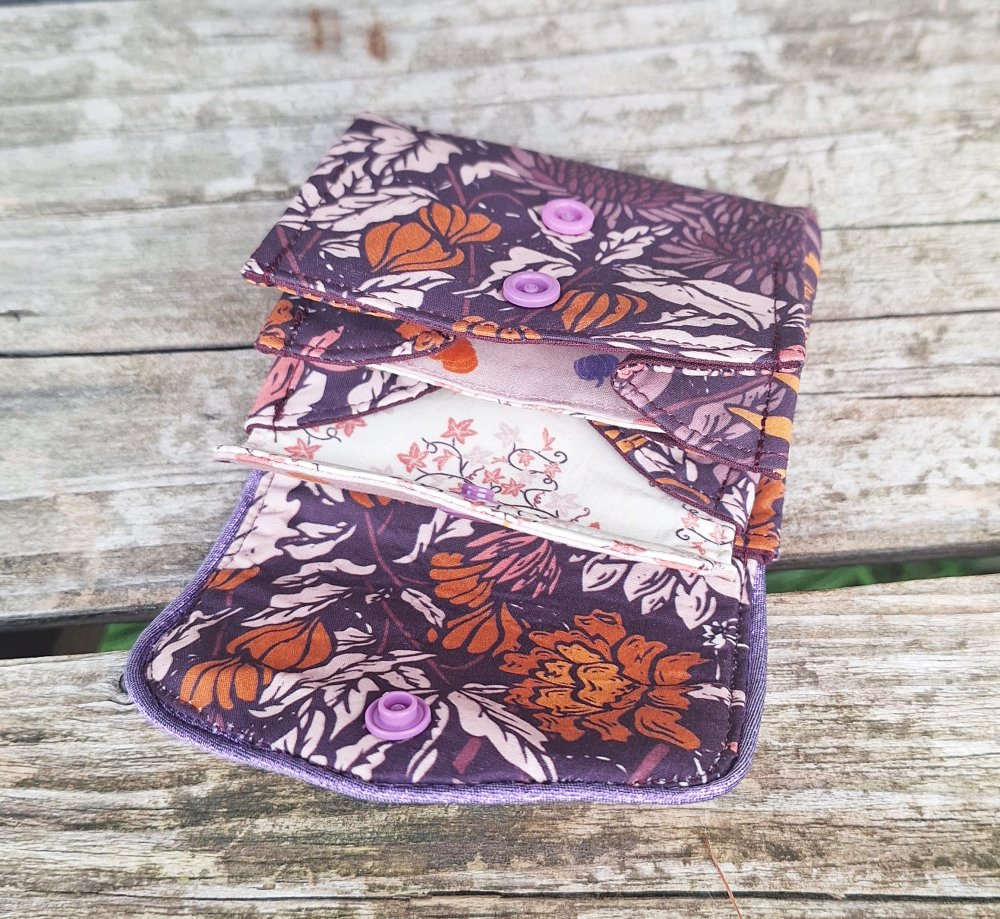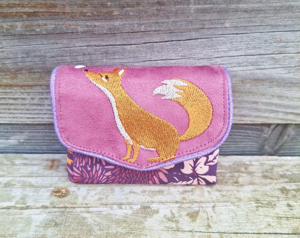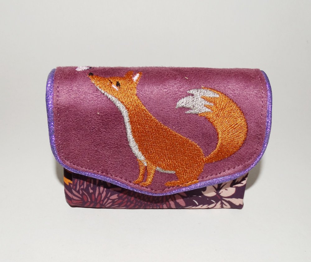 Petit porte-monnaie accordéon pour femme avec broderie renard en suédine violine et tissu aubergine avec des fleurs, porte-cartes, cadeau original et pratique