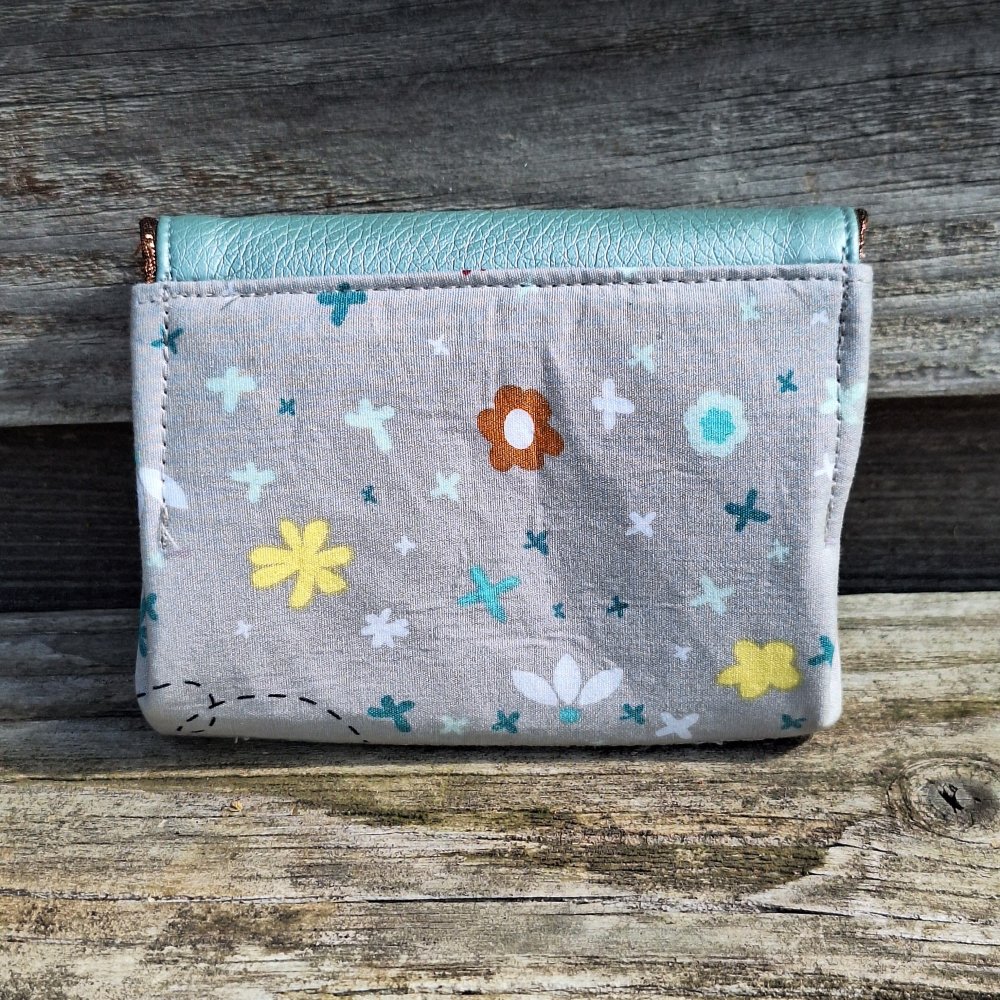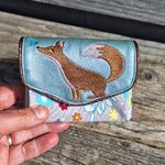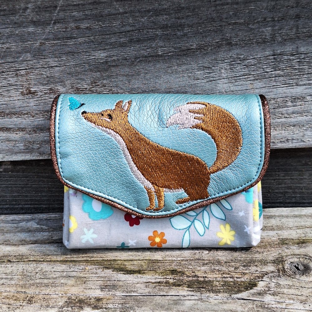 Petit porte-monnaie accordéon femme, broderie renard, faux cuir vert clair et tissu gris avec des fleurs, porte-cartes, 3 compartiments