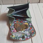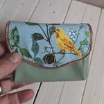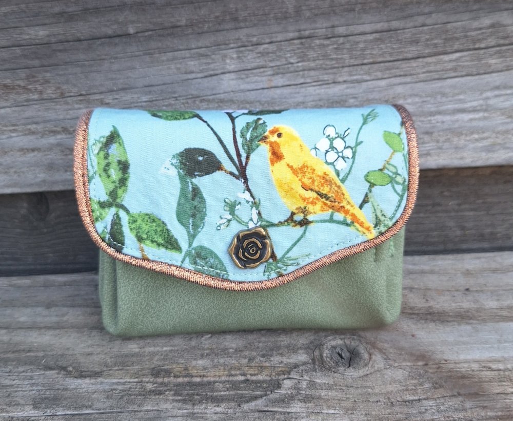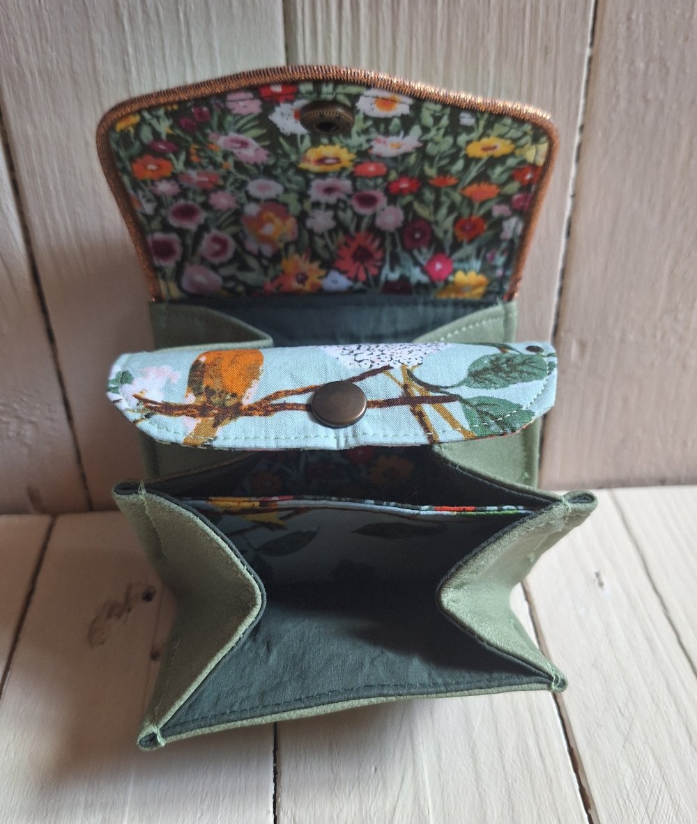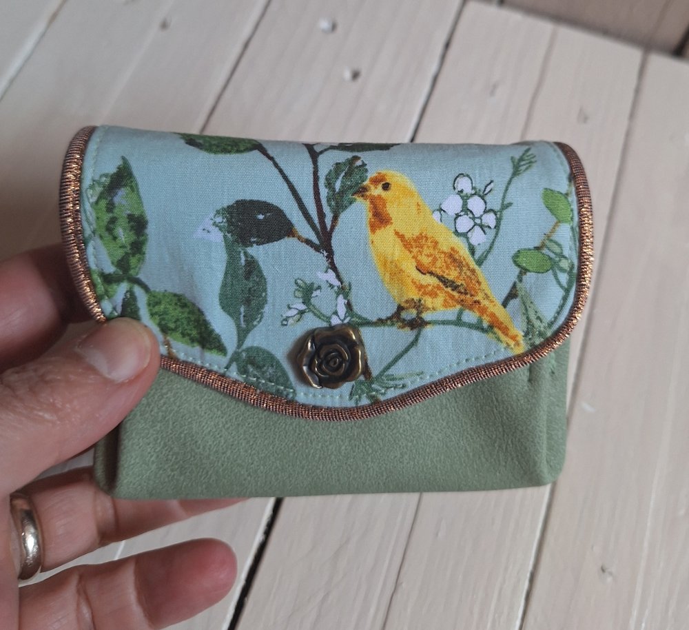 Petit porte-monnaie accordéon femme avec en faux cuir vert amande et tissu vert clair avec oiseaux,3 compartiments, cadeau fait-main en France