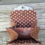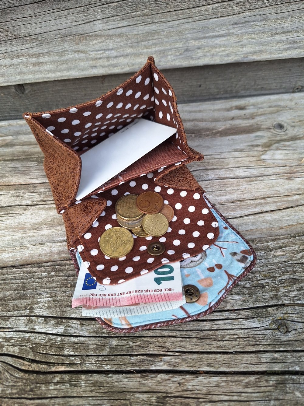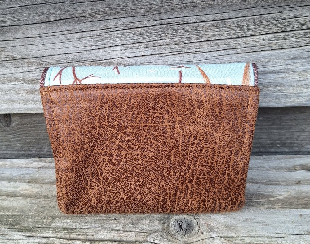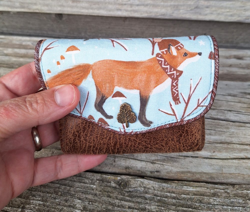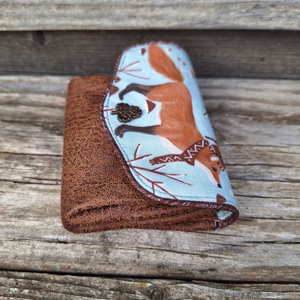 petit porte-monnaie accordéon pour femme en tissu bleu clair avec un renard et en faux cuir camel, 3 compartiments porte-cartes, cadeau fait-main en France
