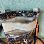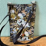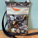 Une pochette en toile enduite unie et imprimée, cotonnade pour la doublure. Bandoulière réglable