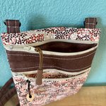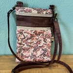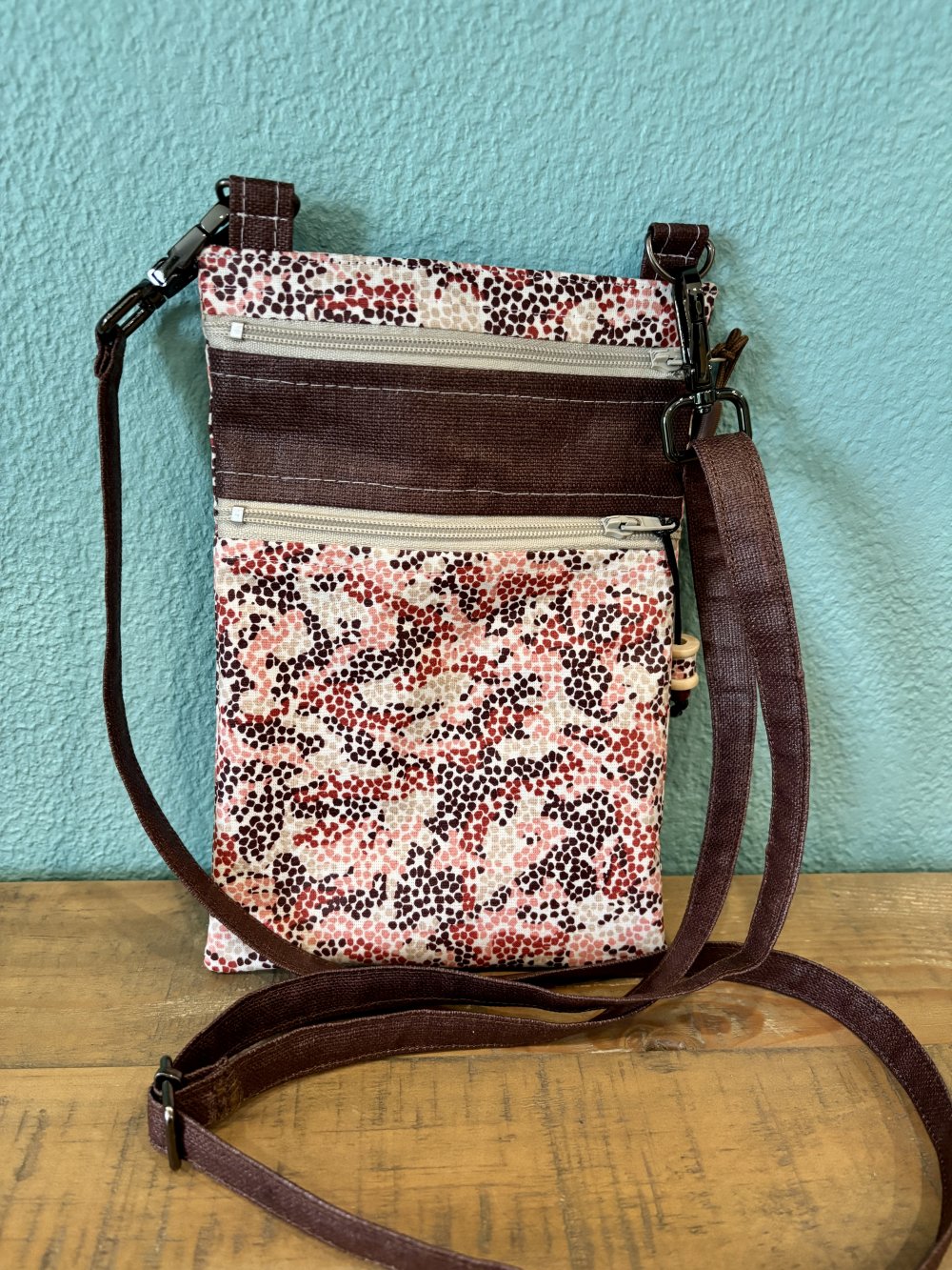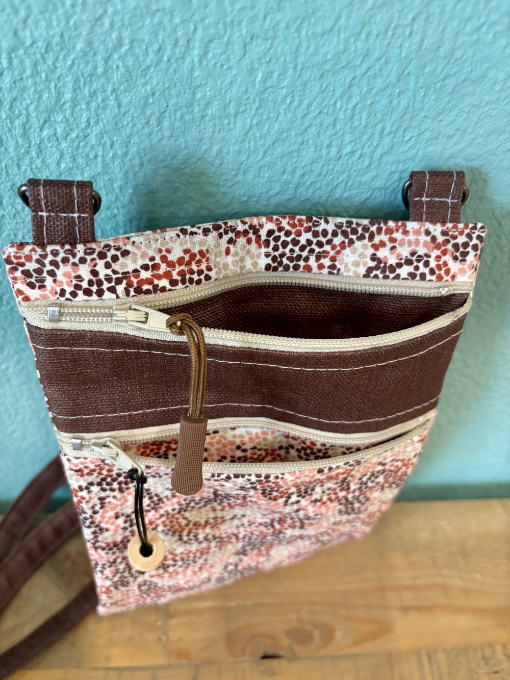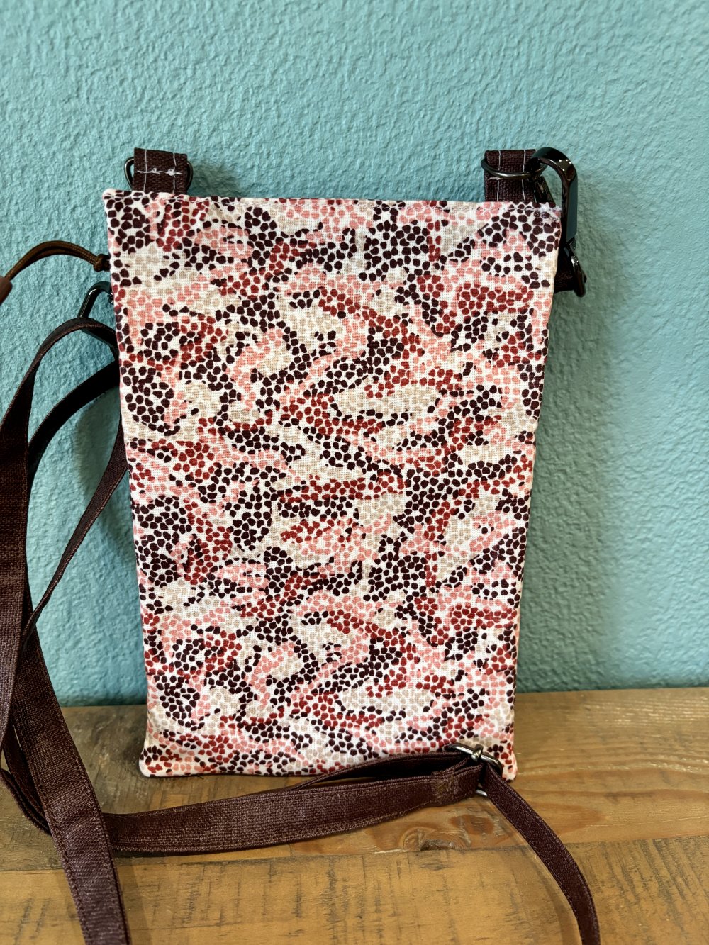Une pochette en toile enduite unie et imprimée, cotonnade pour la doublure. Bandoulière réglable