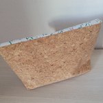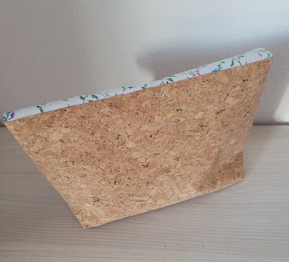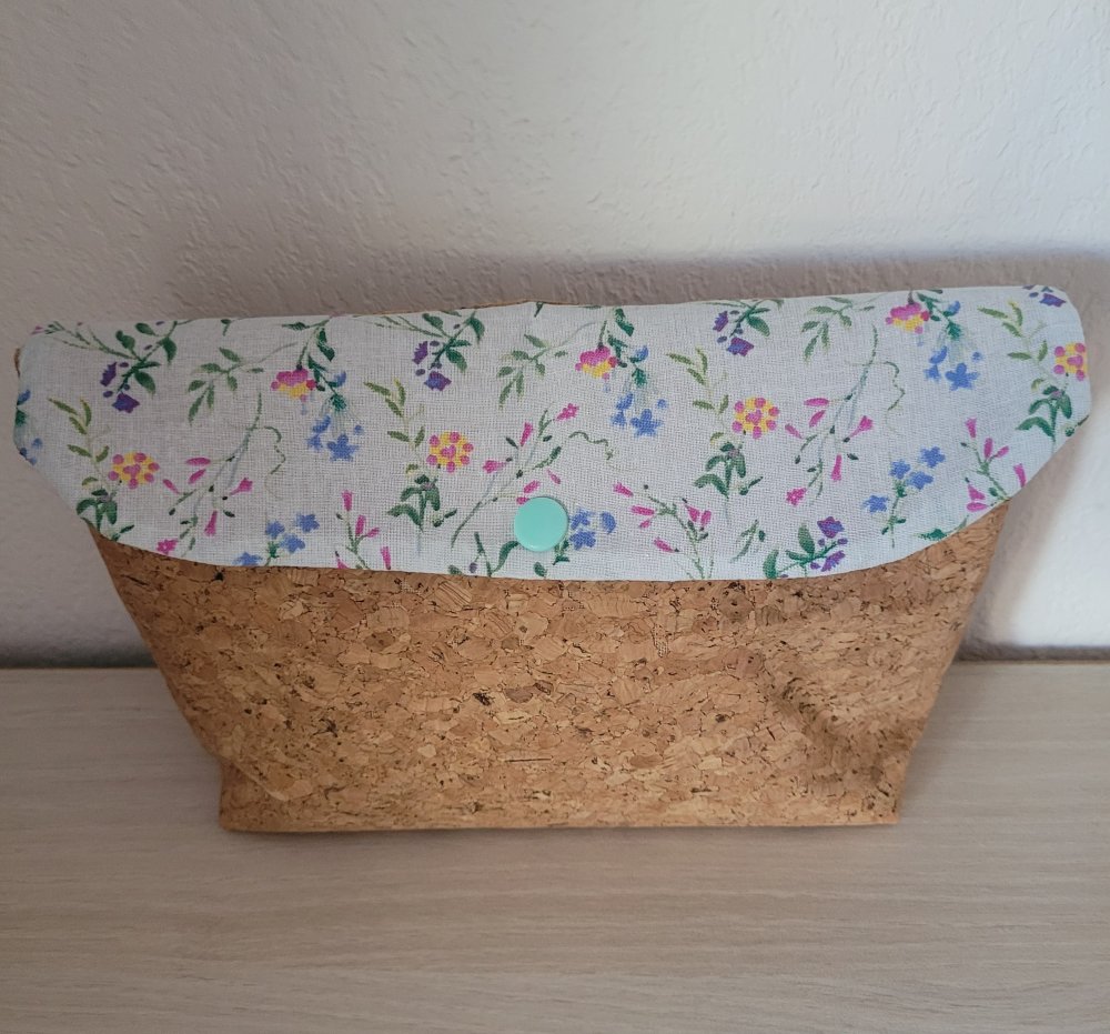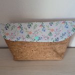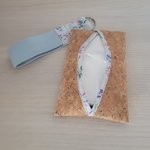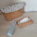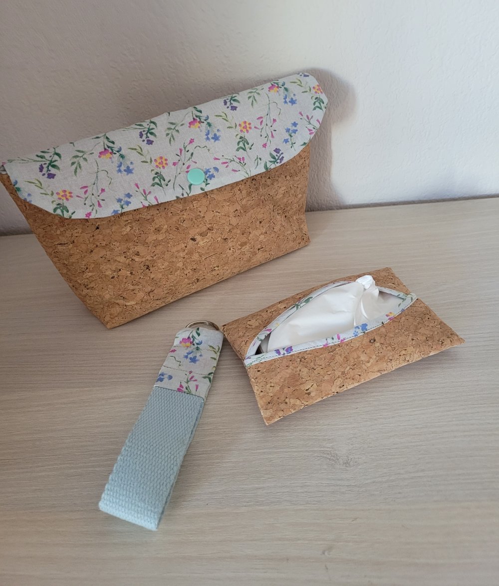 Ensemble composé d'une pochette (23x13cm),d'une pochette à mouchoirs, et d'un porte clés. Le tout assorti. Tissu liège et coton fleuri bleu pâle.