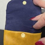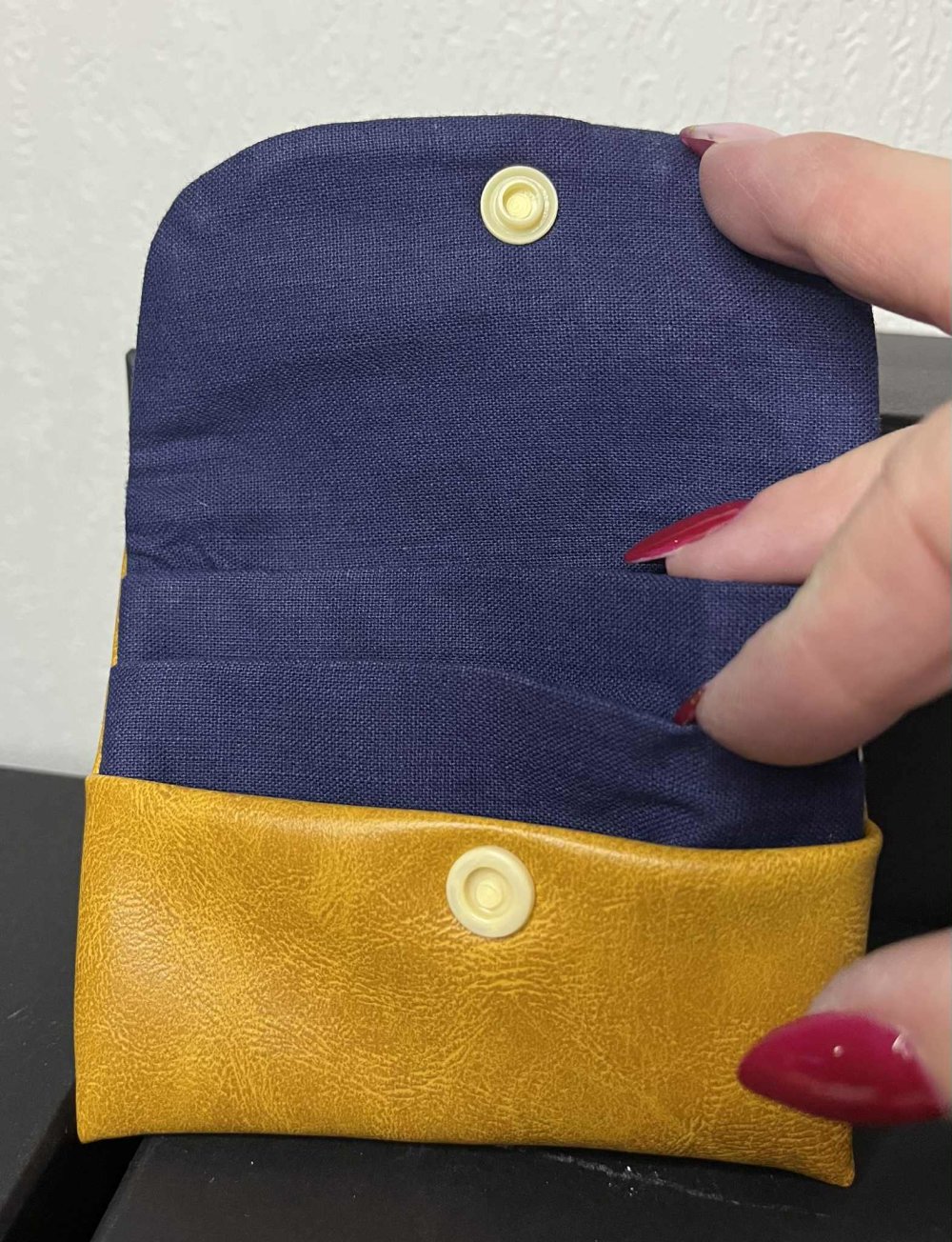 Le similli-cuir moutarde évoque la lumière du soleil et la confiance en soi, tandis que le coton bleu marine apporte profondeur et sérénité.