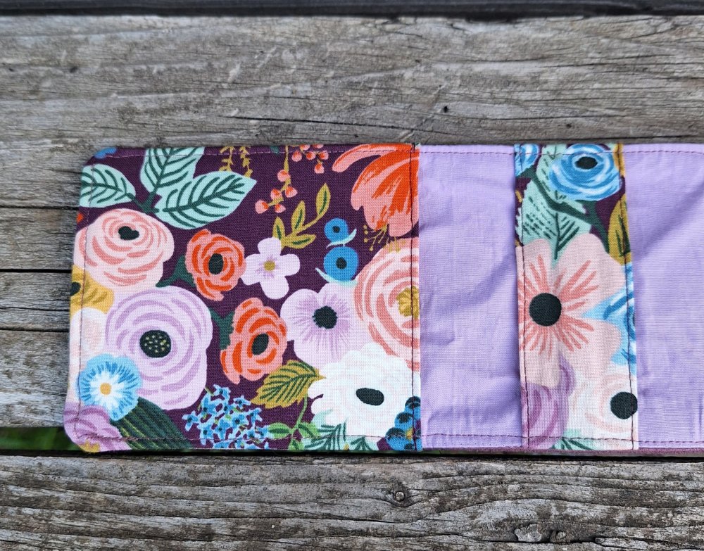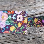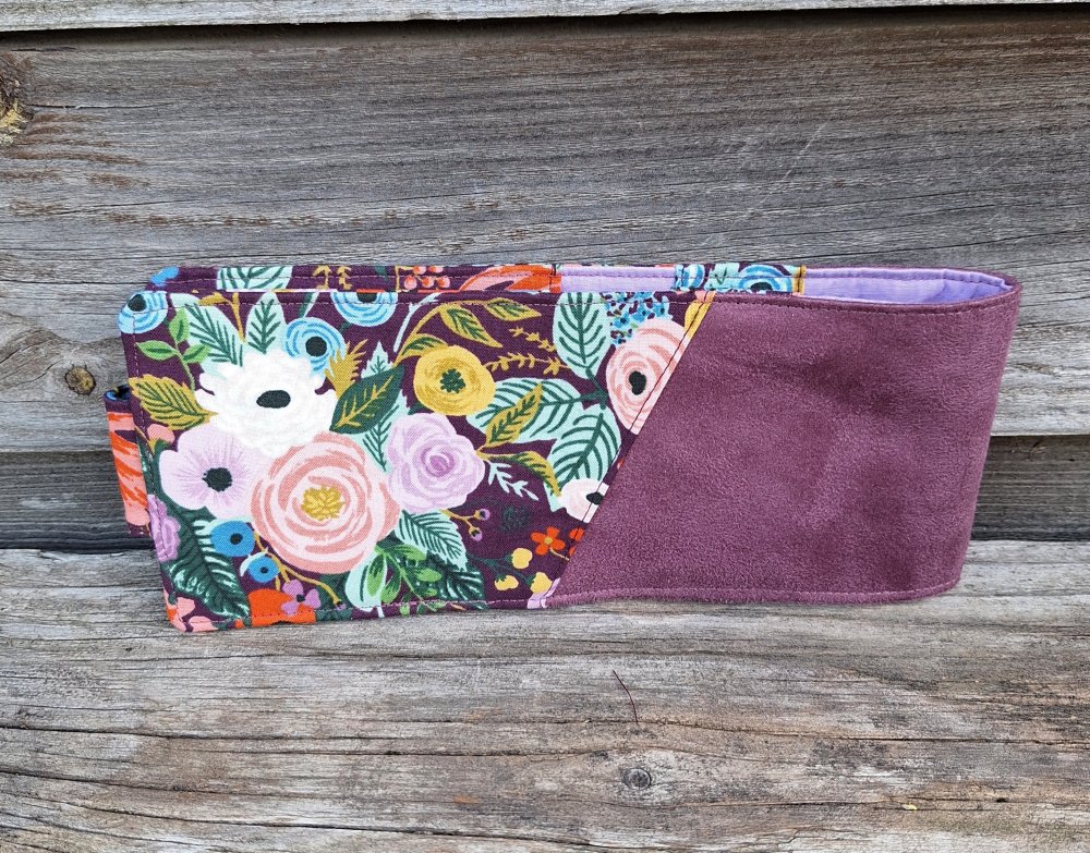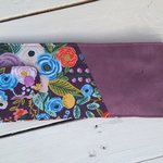 Porte-chéquier femme horizontale, souche à gauche classique en suédine violine et tissu avec des fleurs colorées, cadeau pour femme cadeau original et pratique