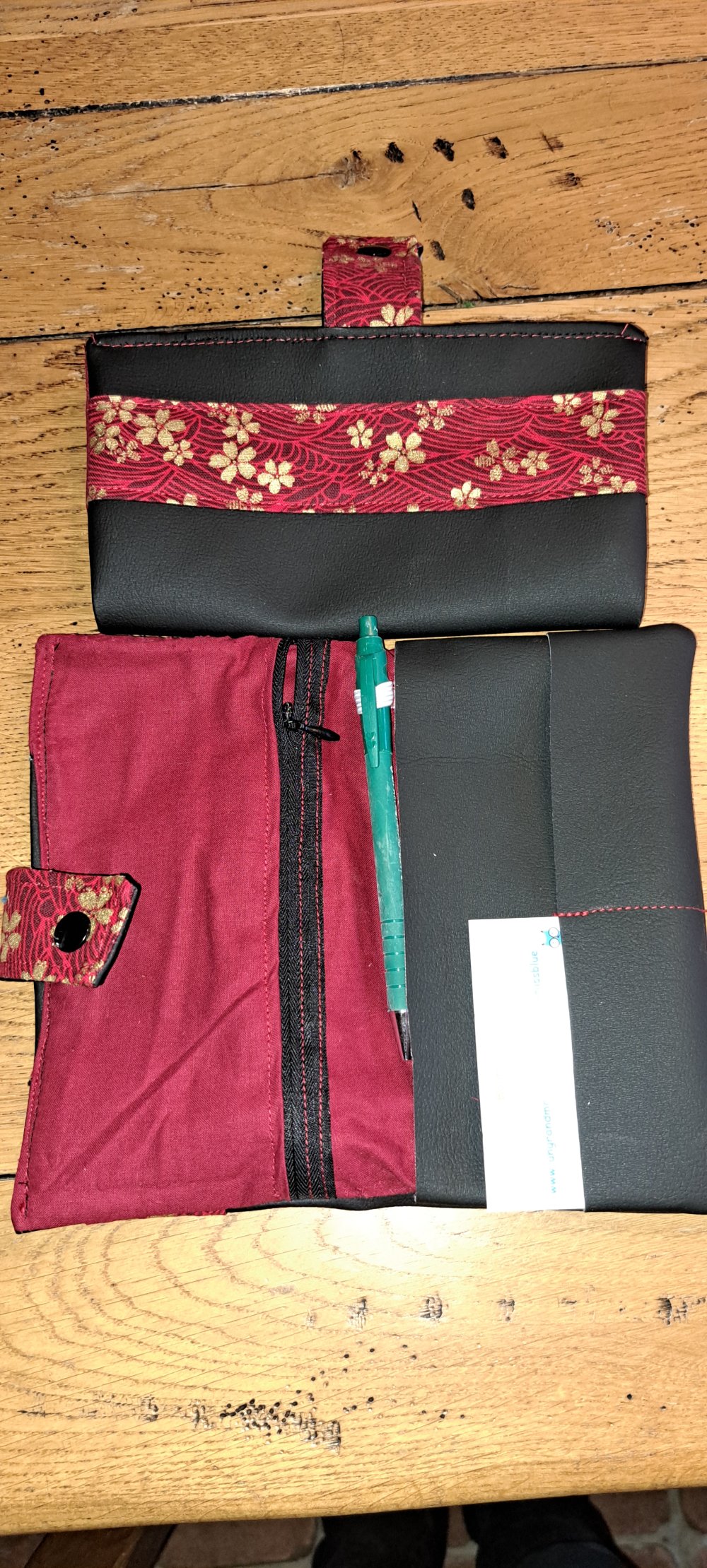 porte chéquier multifonctions en simili cuir noir et tissu rouge japonais et fermeture par patte avec pression