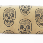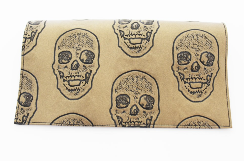 Porte chéquier en simili cuir doré avec des des têtes de morts noires