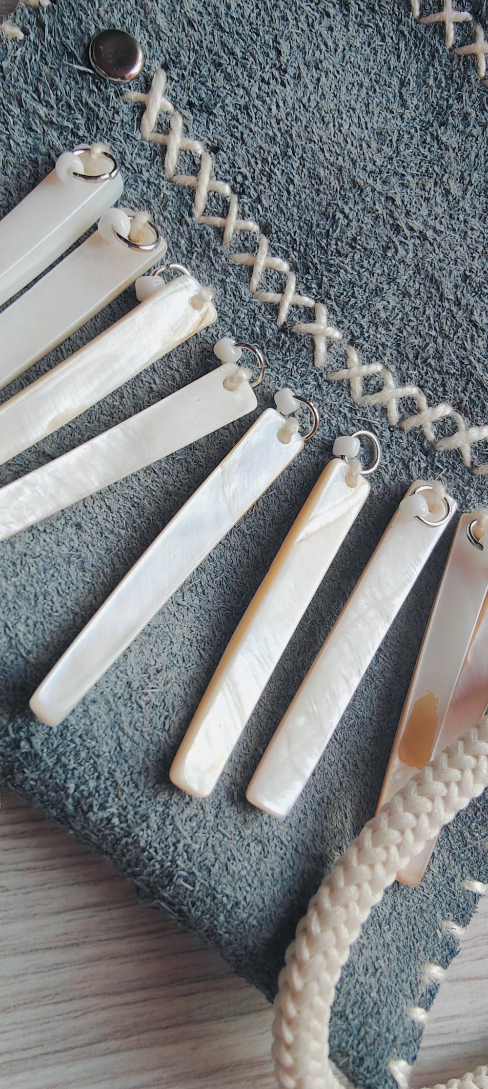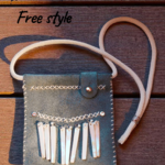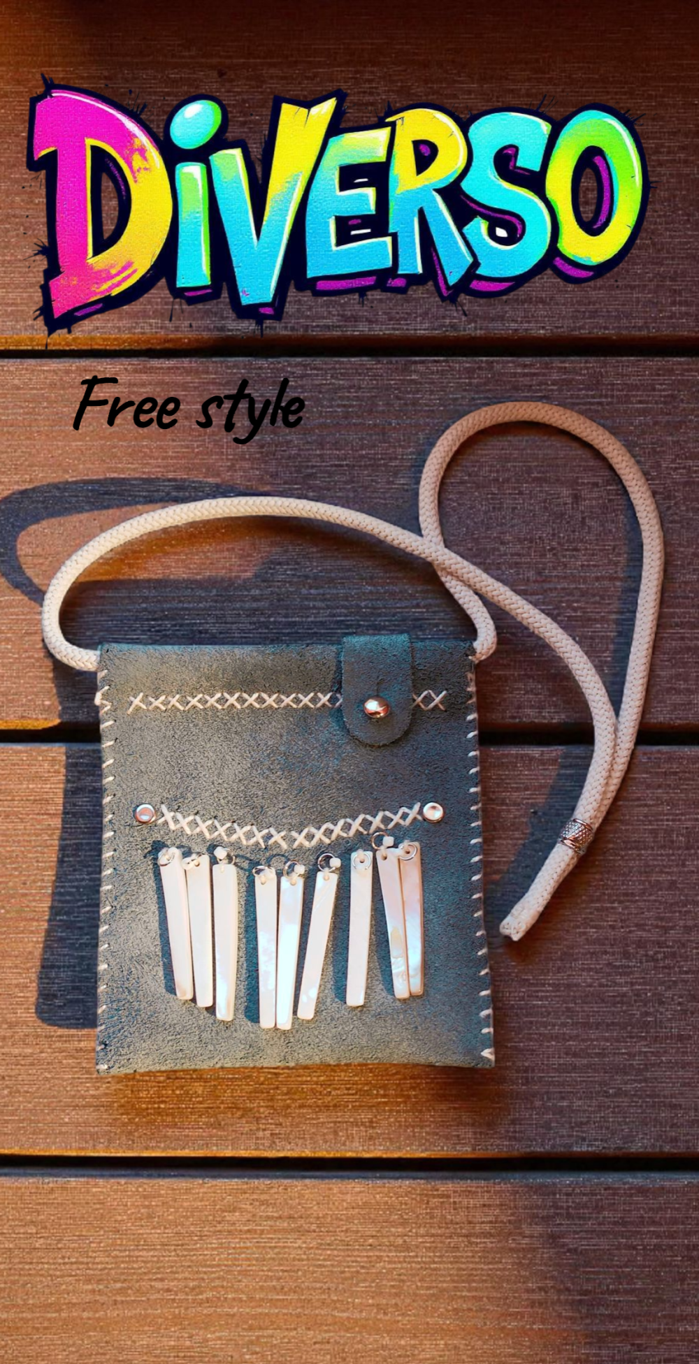 DIVERSO free style. Création unique et originale ( fait main). Porte monnaie, sacoche, bourse, elle est créée en daim véritable gris et " griffes" en Nacre. Attache facile