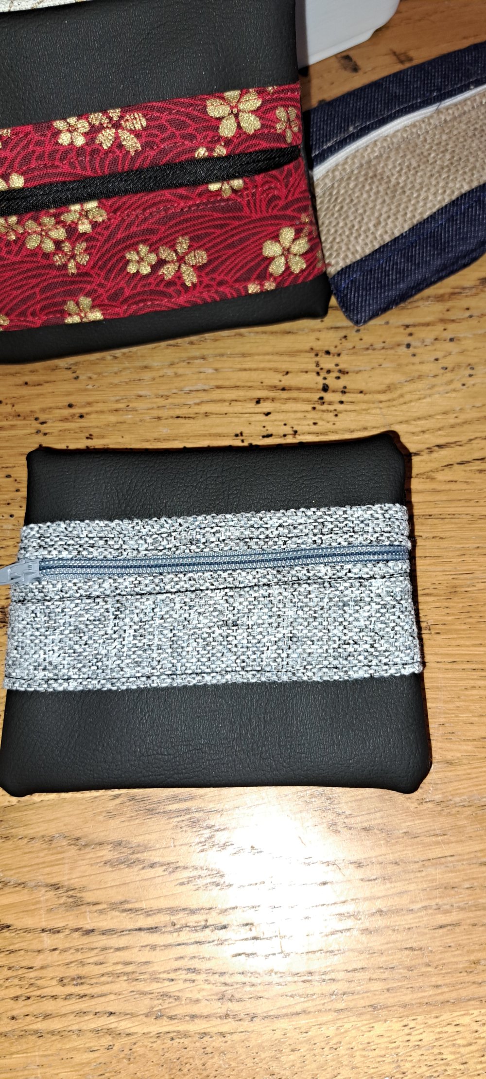 porte monnaie en similicuir noir et tissu gris avec fermeture