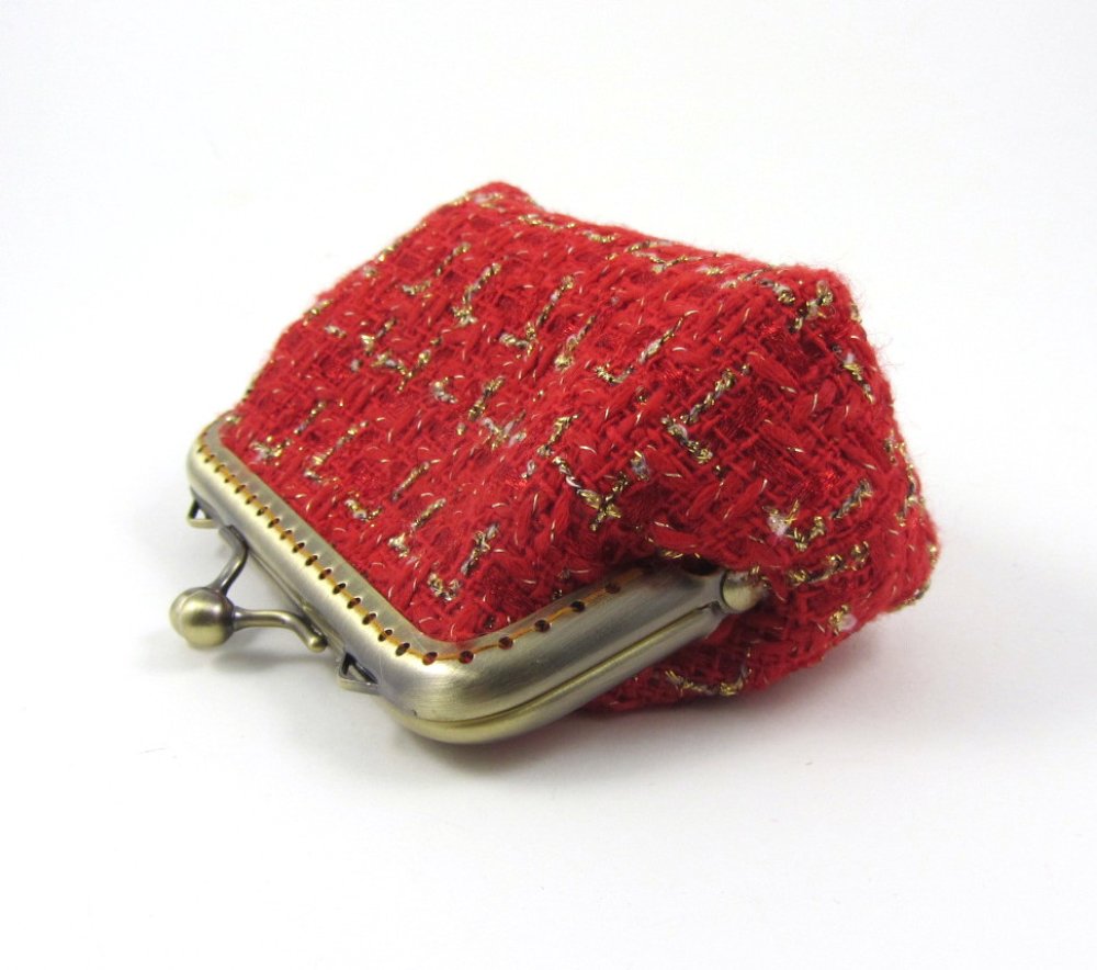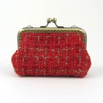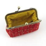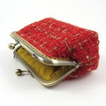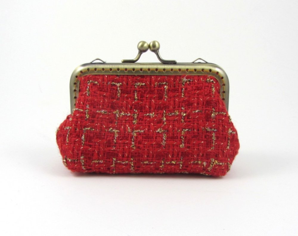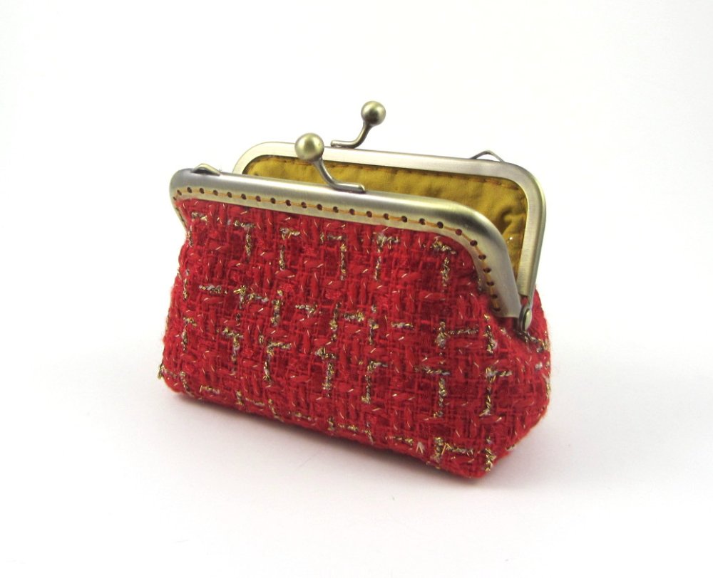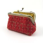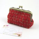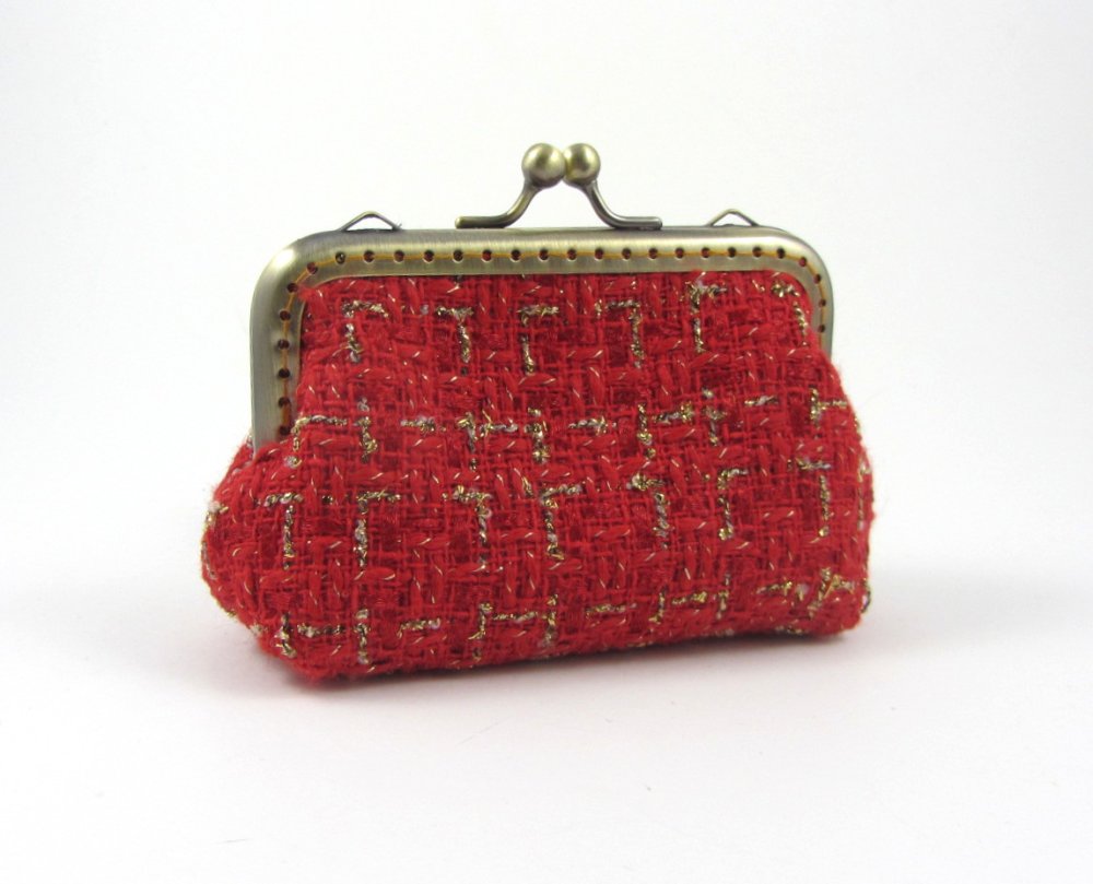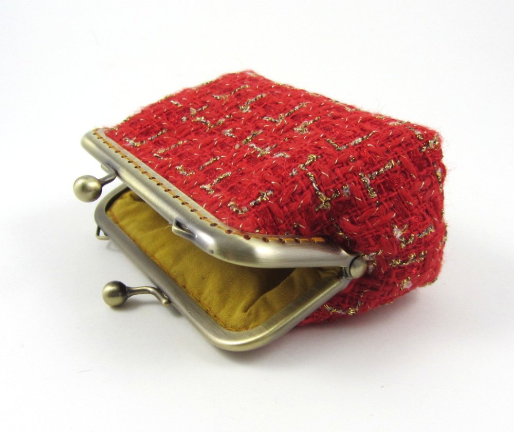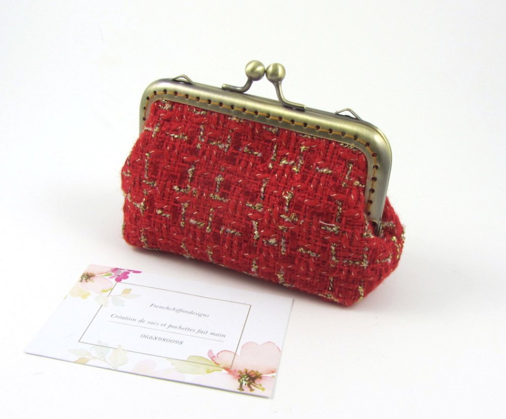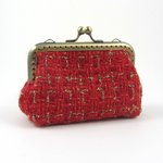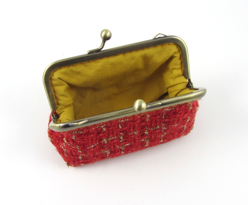 Porte monnaie et porte cartes en tissu de laine cardée rouge et or.