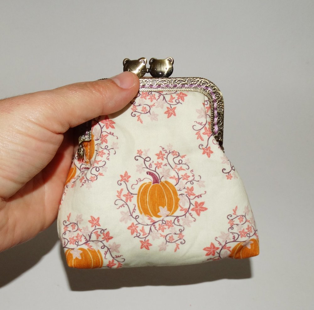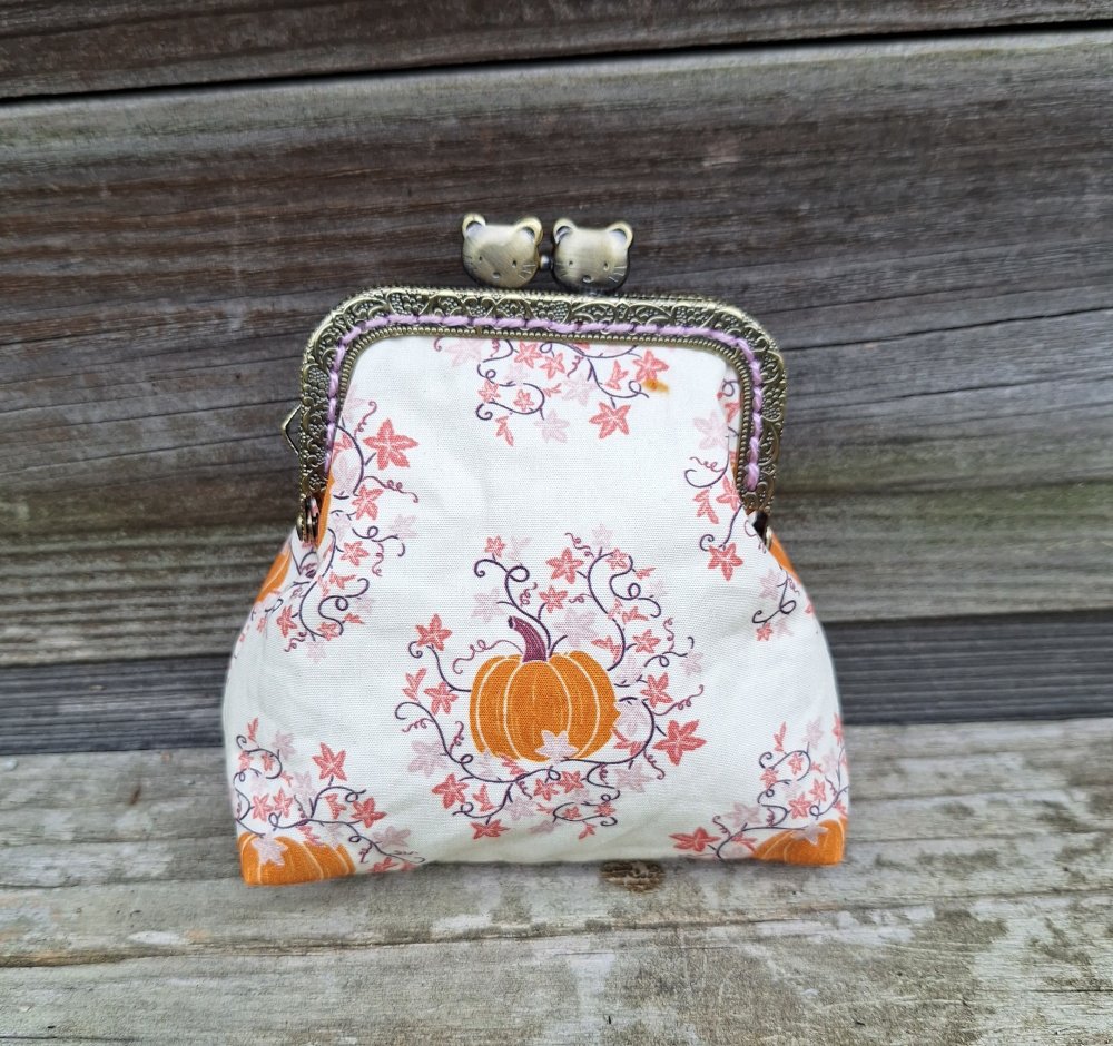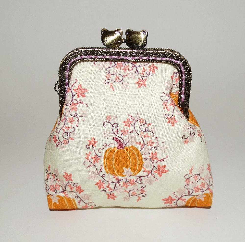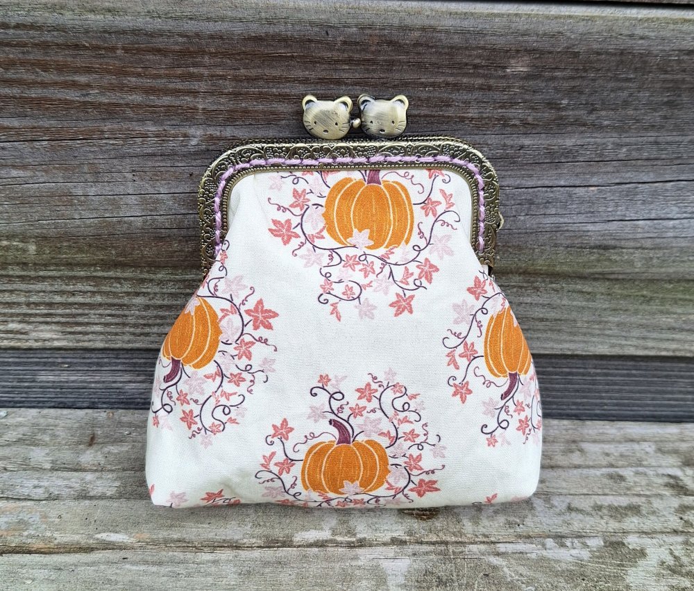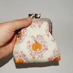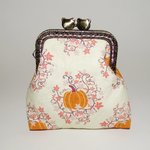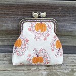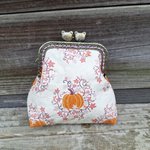 Porte-monnaie rétro femme en blanc cassé avec des citrouilles et tissu caramel avec des fleurs, fermoir métallique bronze, bourse vintage pour bijoux, maquillage, cadeau original et bohème