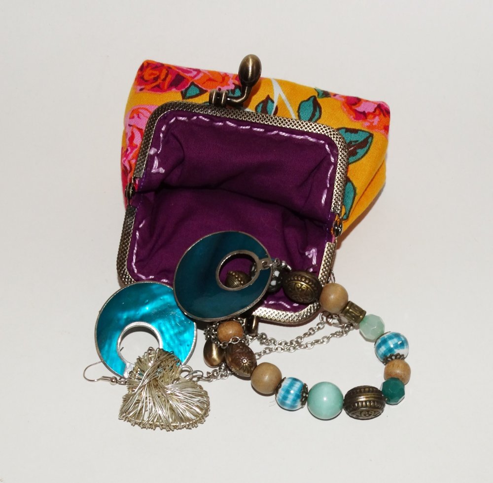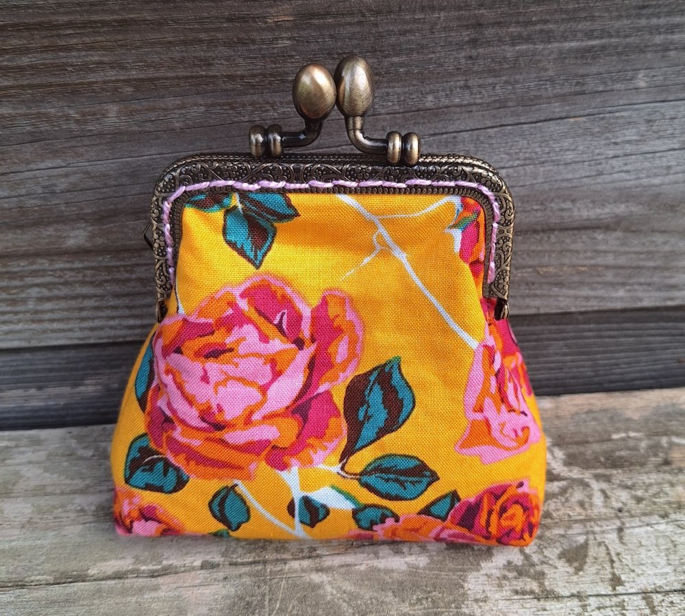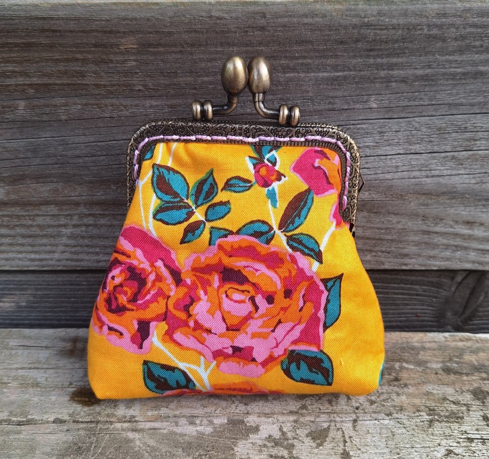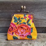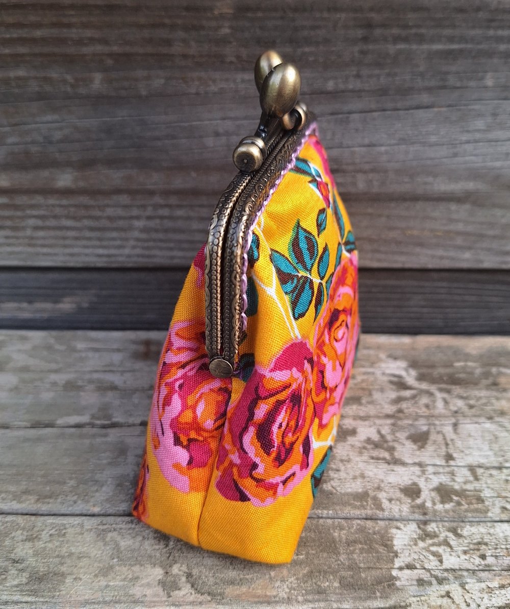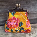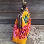 Porte-monnaie rétro femme en tissu jaune avec des roses, fermoir métallique bronze, bourse vintage pour bijoux, maquillage, cadeau original et bohème