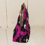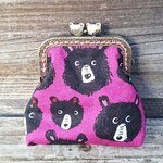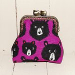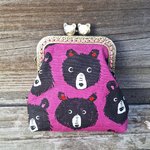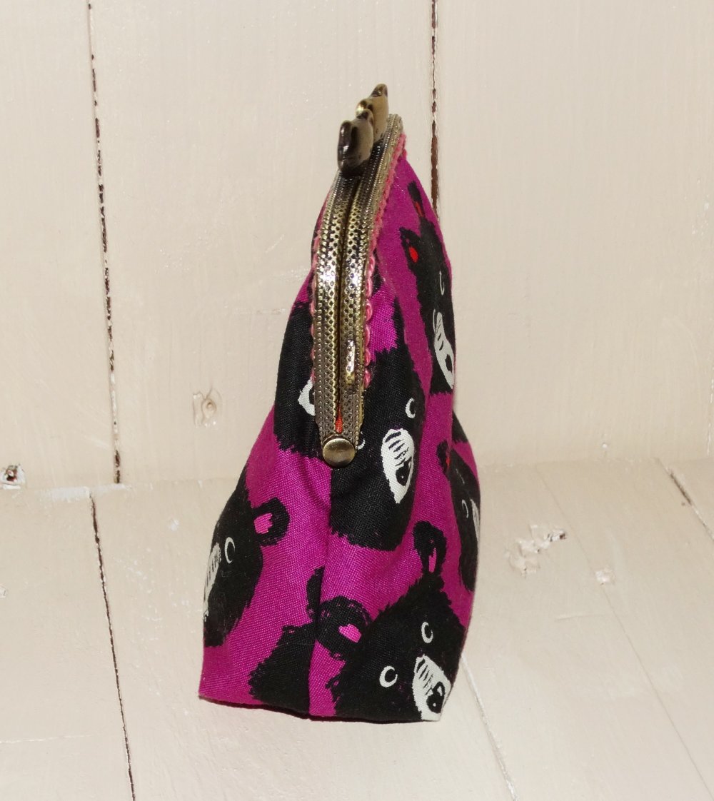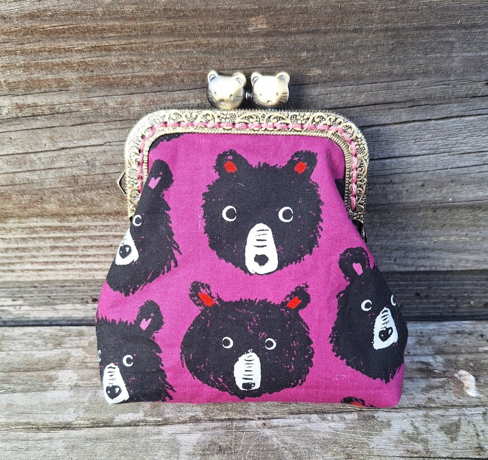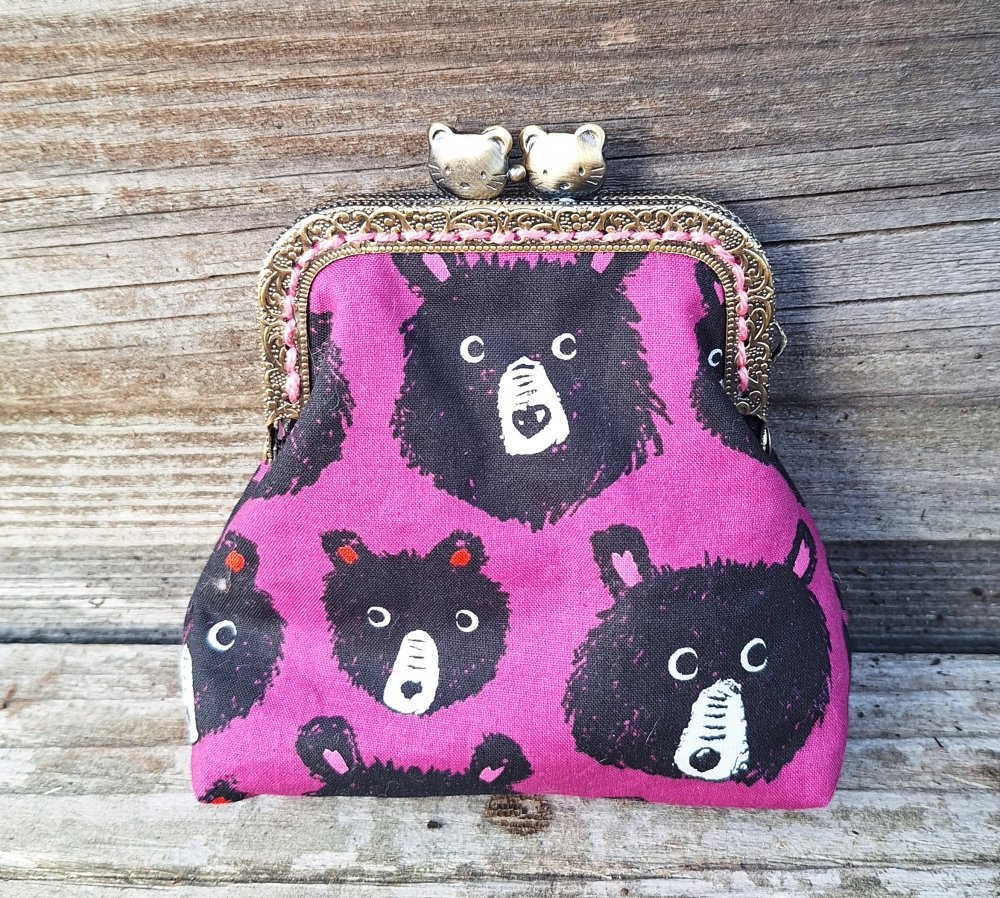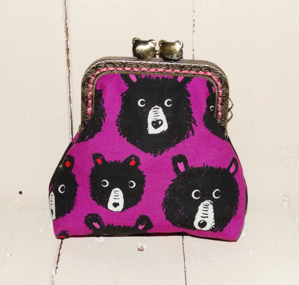 Porte-monnaie rétro femme en tissu violine avec des ours, fermoir métallique bronze avec des chats, bourse vintage, idée cadeau femme