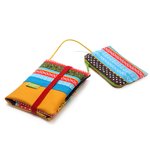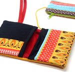 Entre similicuir jaune, tissu motifs géométriques colorés et cordelette maligne jaune, ce petit portefeuille compact de 13,5 x 10 cm a le don de tout ranger avec originalité.