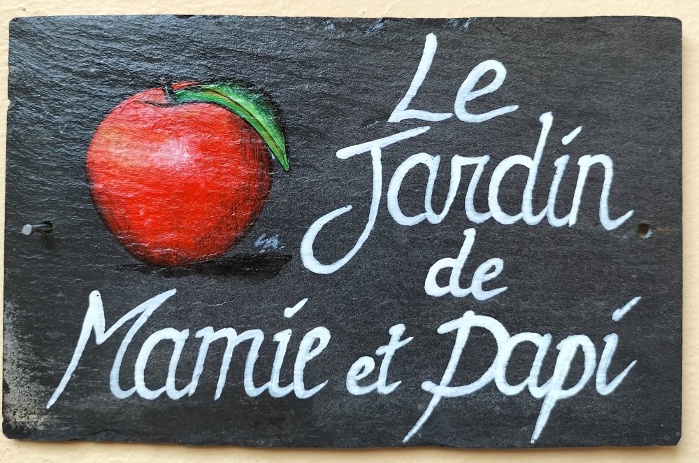 Plaque de jardin, pour rendre originale le jardin de papi et mamie. Réalisée à la peinture acrylique, elle est protégée par un vernis très résistant, elle est aussi percée pour une fixation facile grâce à des clous ou une cordelette.