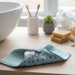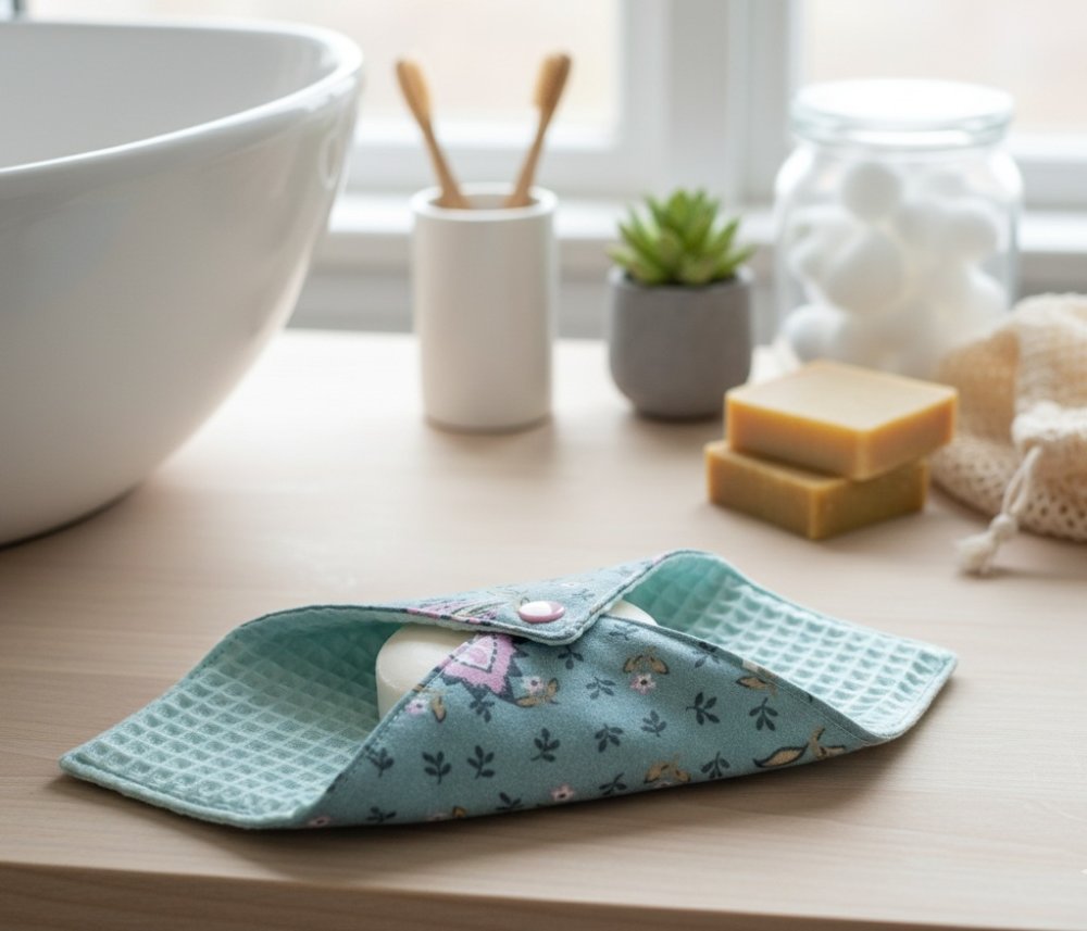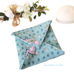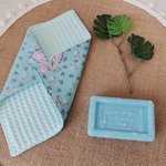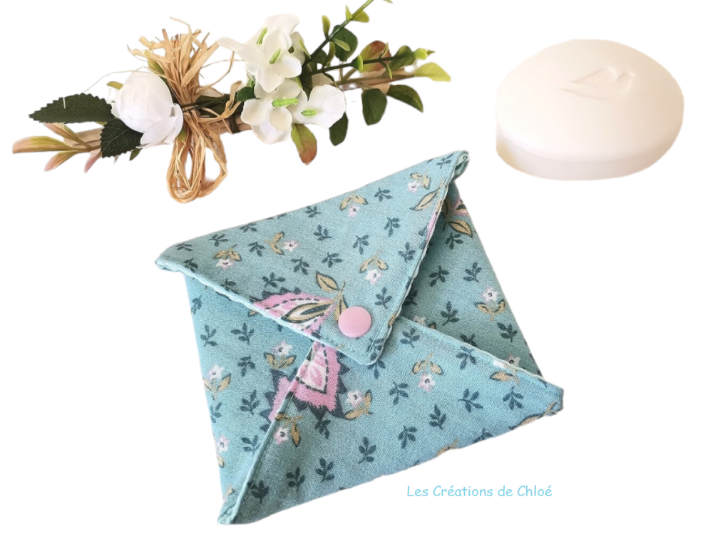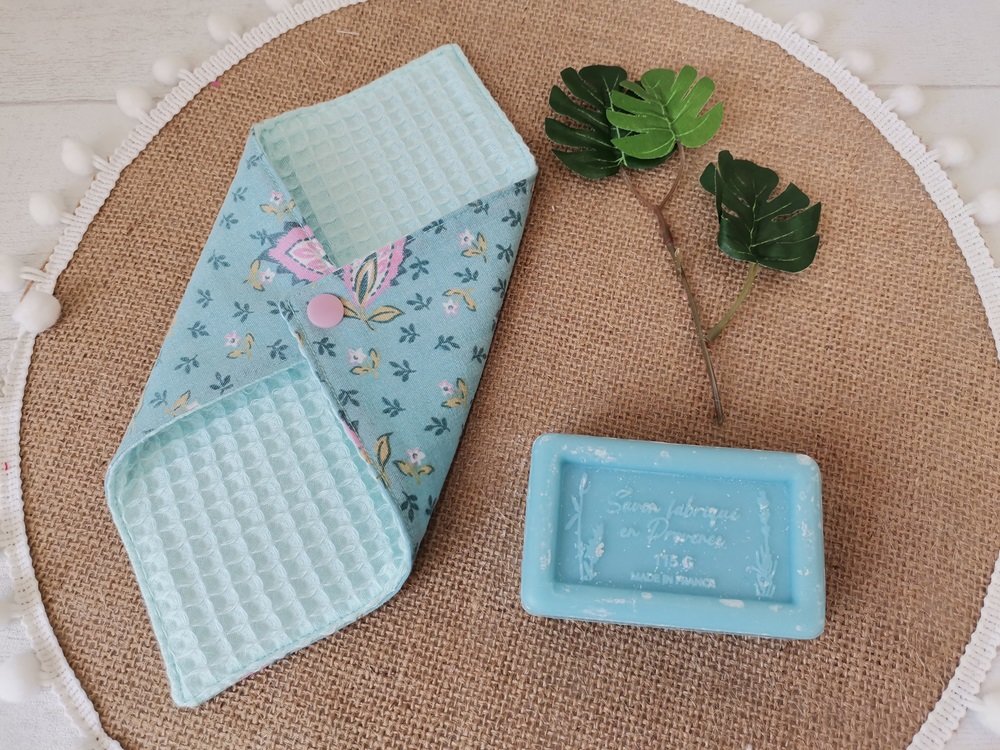 Fait mains : jolie petite pochette à savon fait en tissu nid d'abeille de couleur bleu ciel pour la doublure et un tissu coton motifs fleurs pour le tissus principal. Se replie et se ferme par un bouton pression résine de couleur violet.