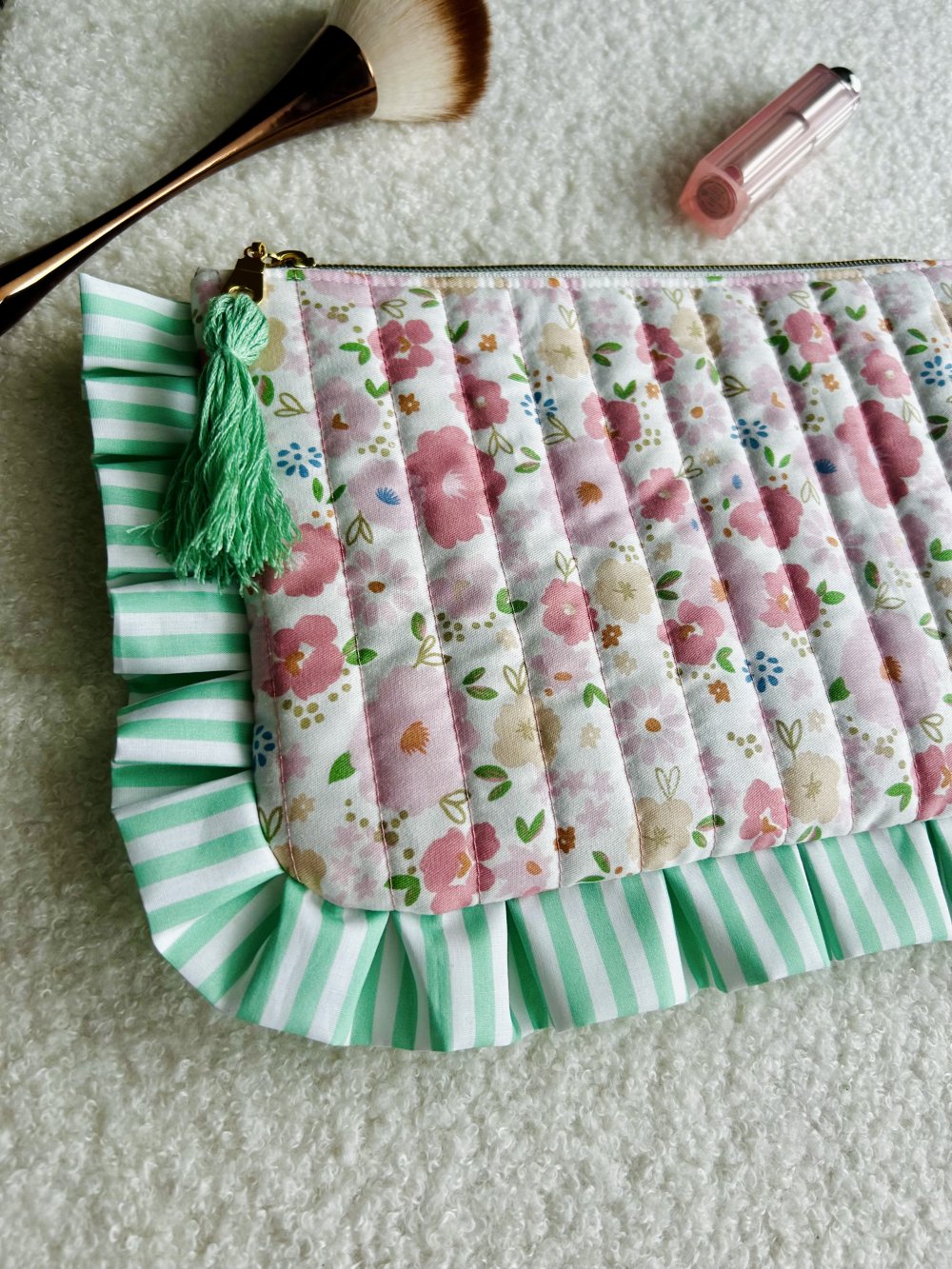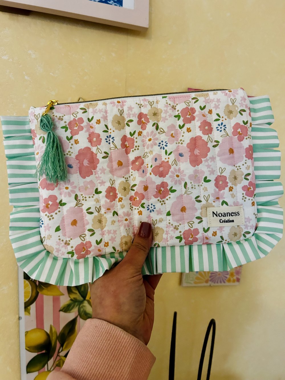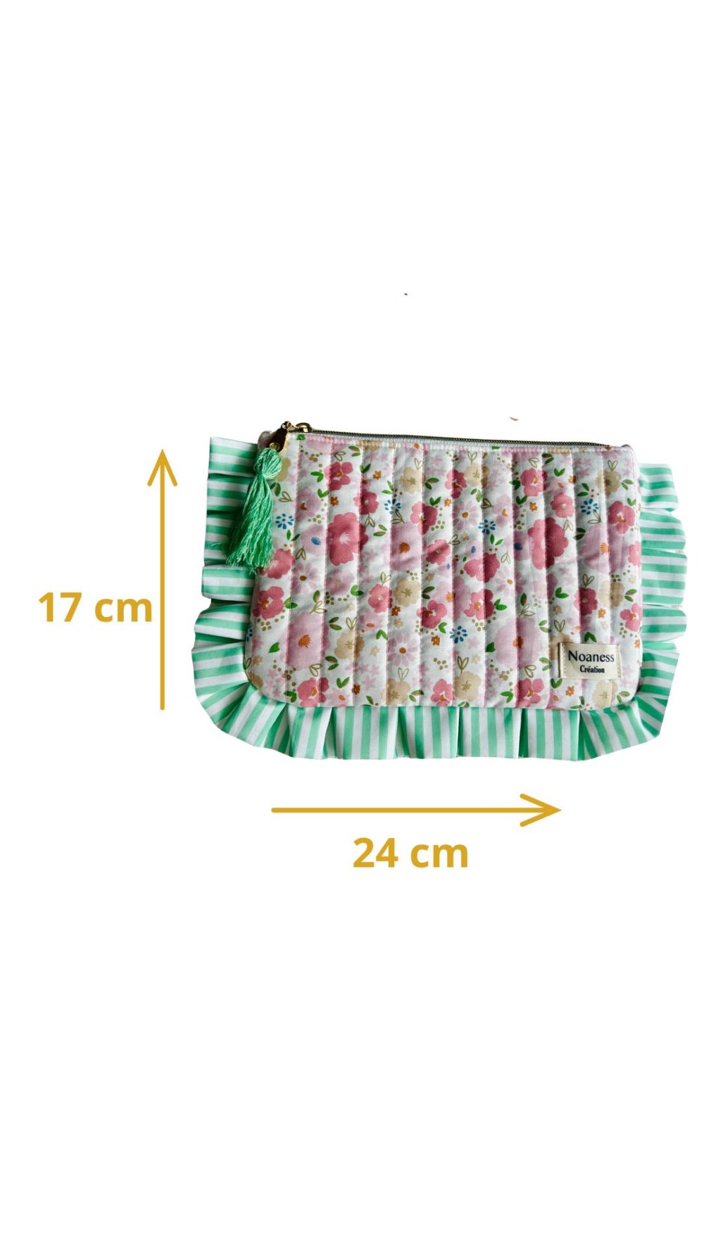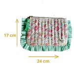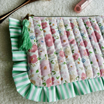 Cette pochette matelassée, issue de la collection, se distingue par ses finitions soignées et son design "coquette" très tendance. Ses volants rayés vert et blanc apportent un contraste frais et dynamique au tissu fleuri printanier.