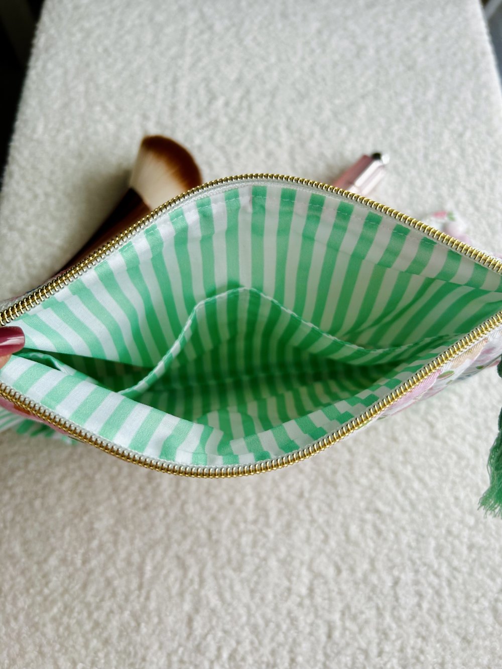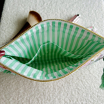 Intérieur ingénieux : Entièrement doublée d'un tissu à rayures vertes, elle cache deux poches intérieures pratiquent pour compartimenter vos petits objets (rouges à lèvres, pinces, bijoux).