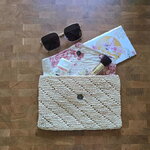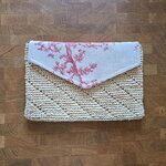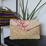 Une pochette en raphia crochetée à la main, sublimée par un rabat en toile de Jouy rose. Idéal pour vos sorties au quotidien.