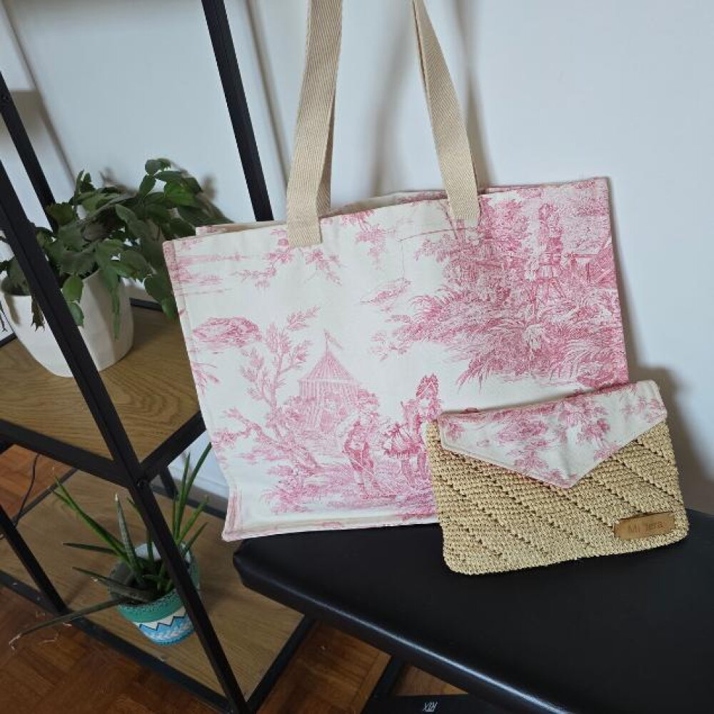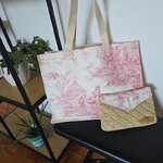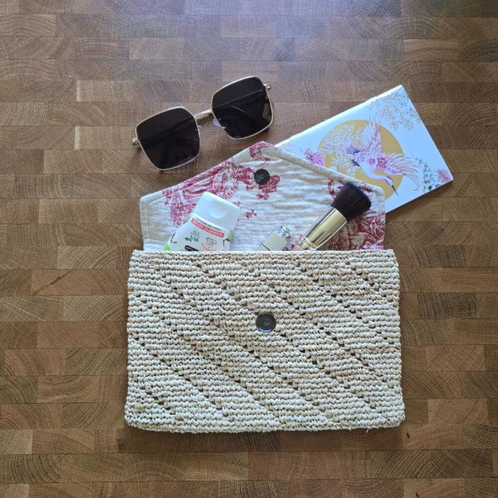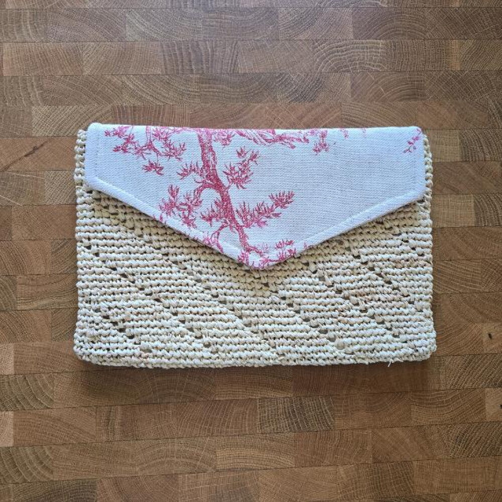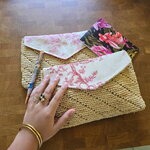 Pochette en raphia avec rabat en toile de Jouy rose – Trousse d'école original – Clutch en raphia crochet fait main