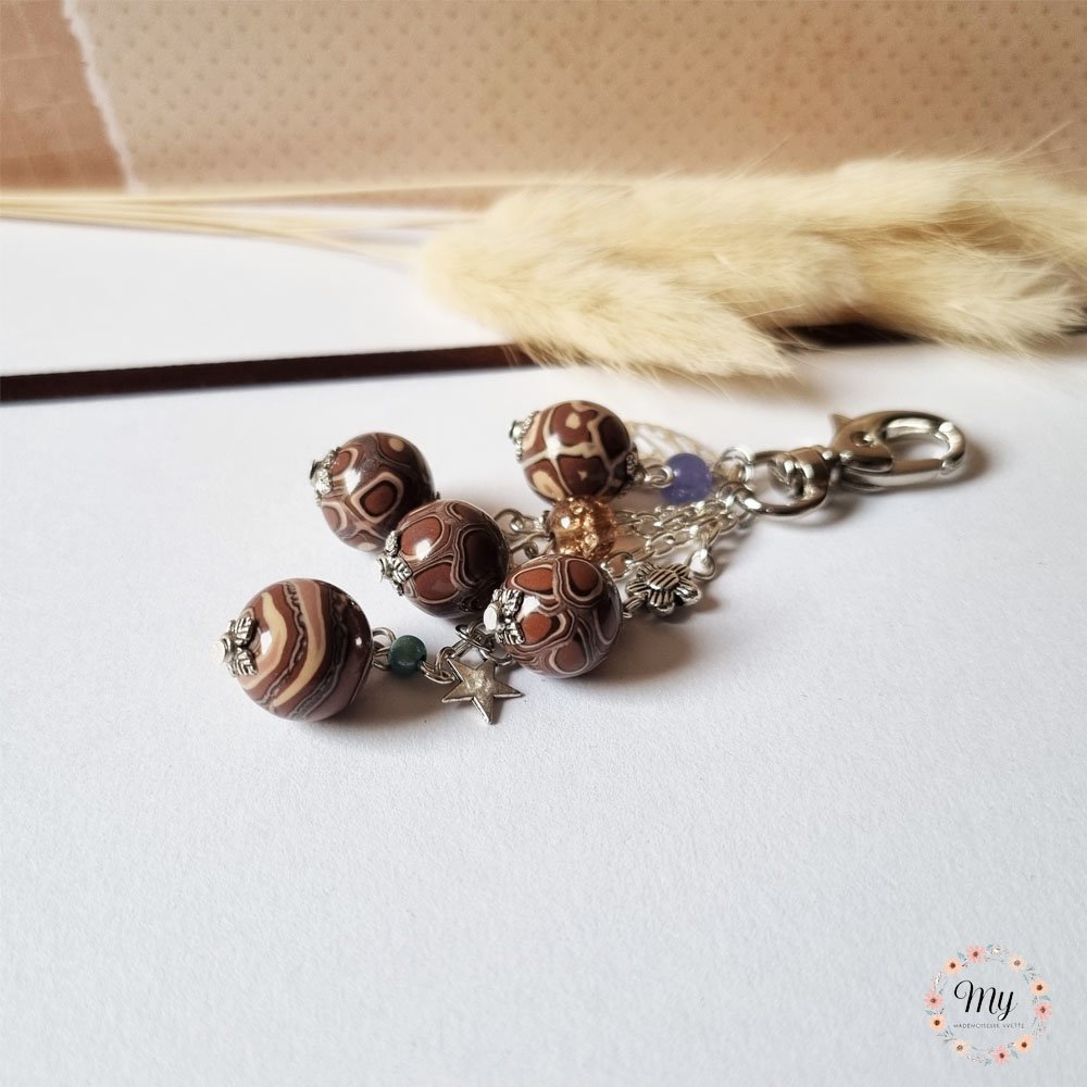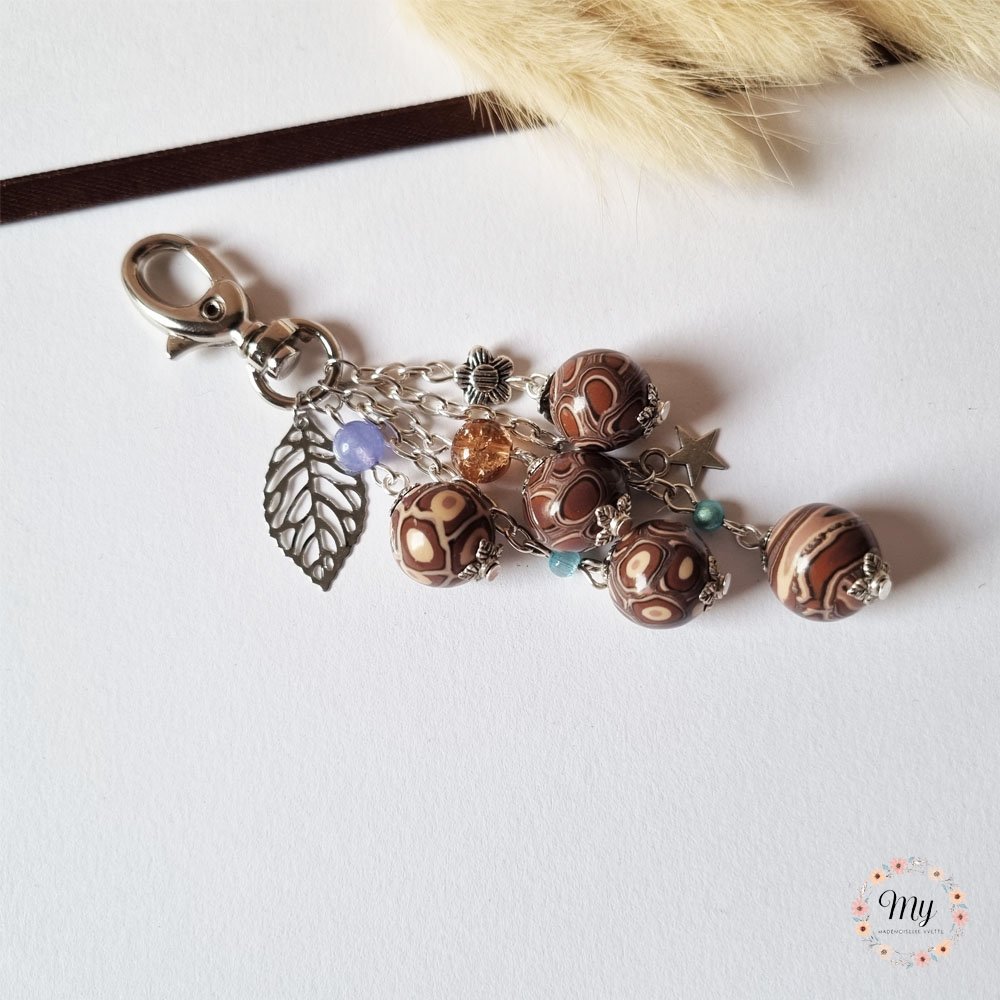 Bijou de sac 5 perles marron, feuille et étoile, en argile polymère