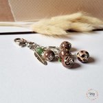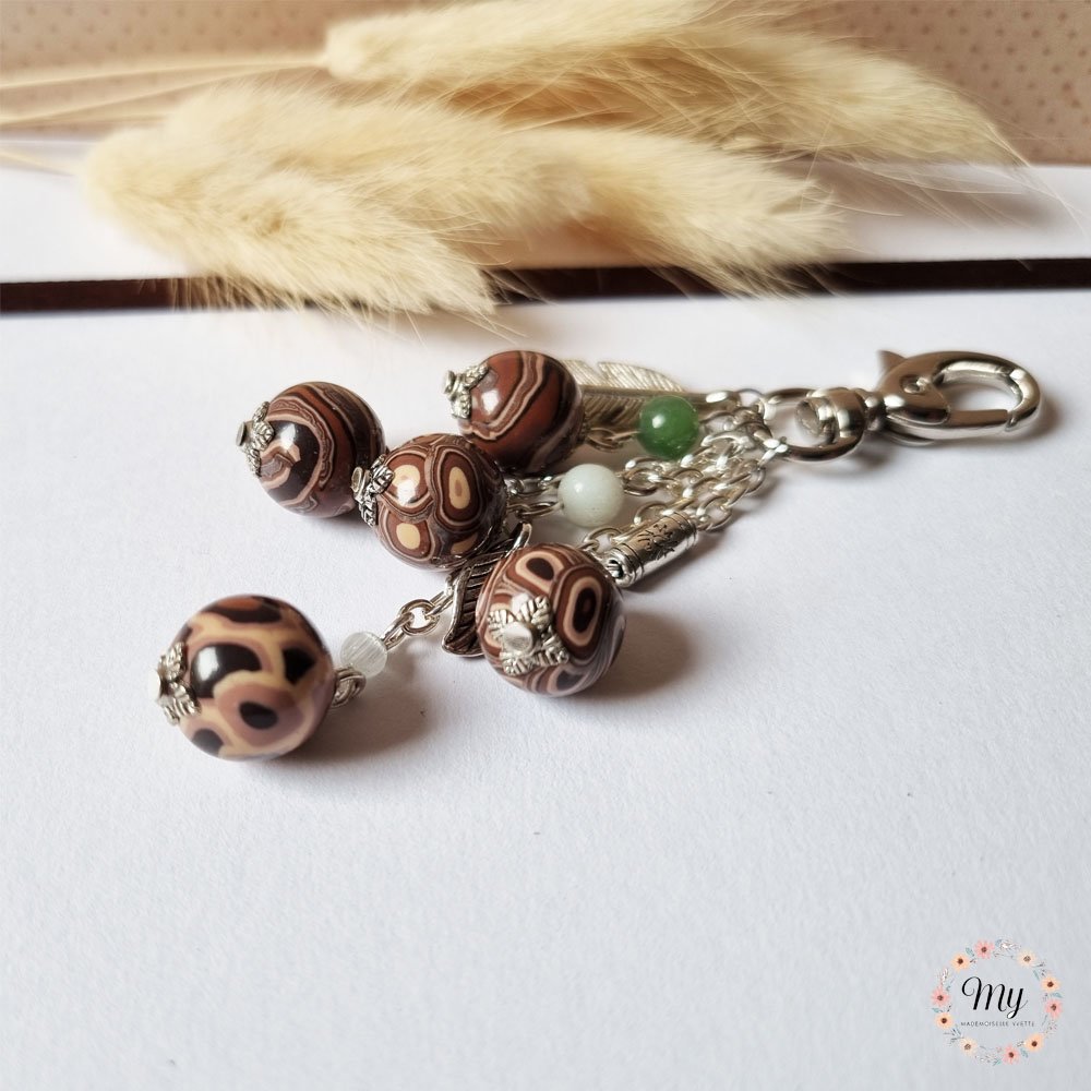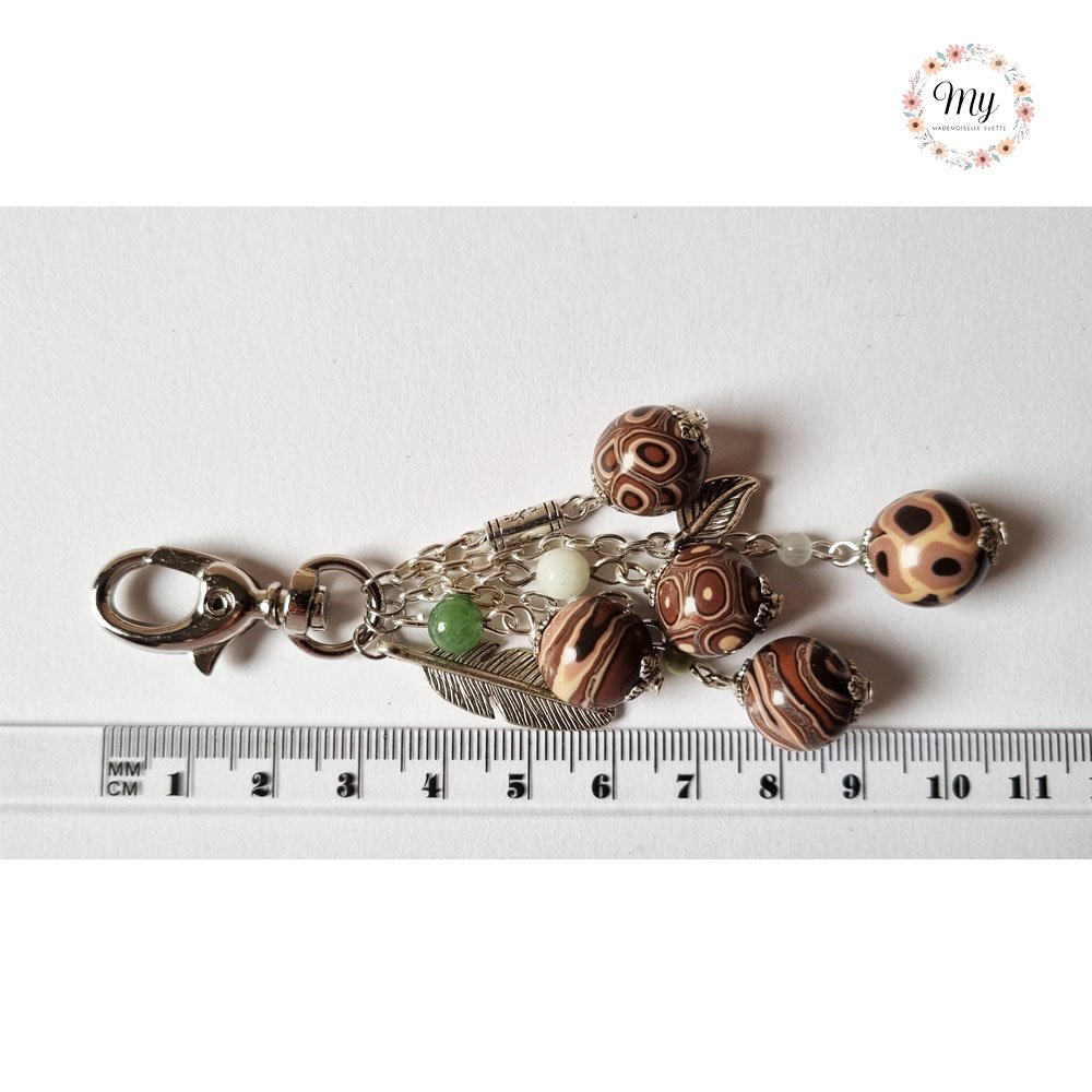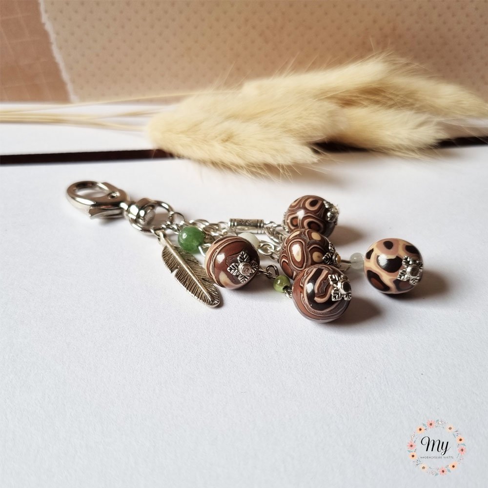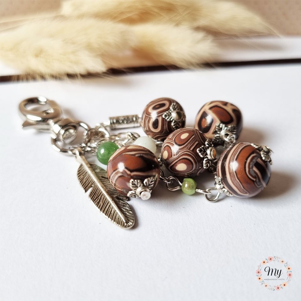 Bijou de sac 5 perles marron, plume et feuille, en argile polymère