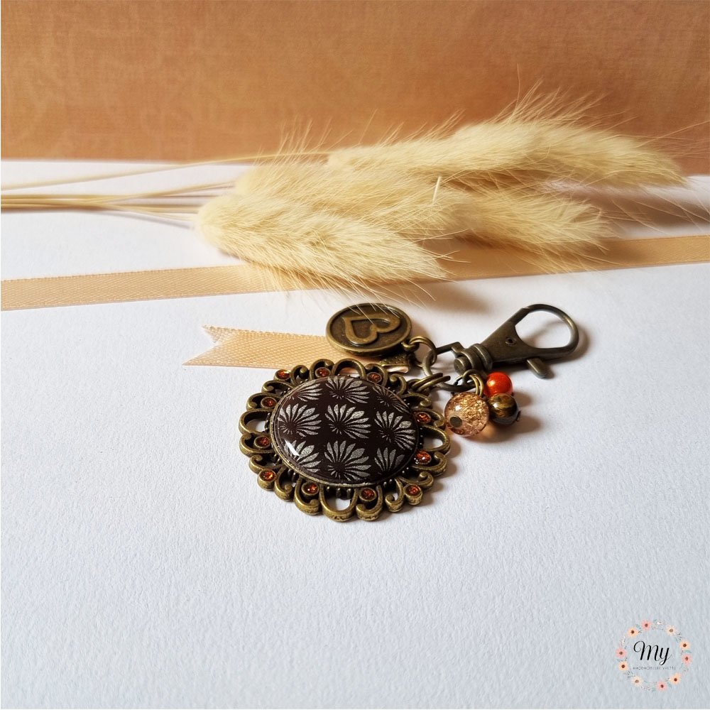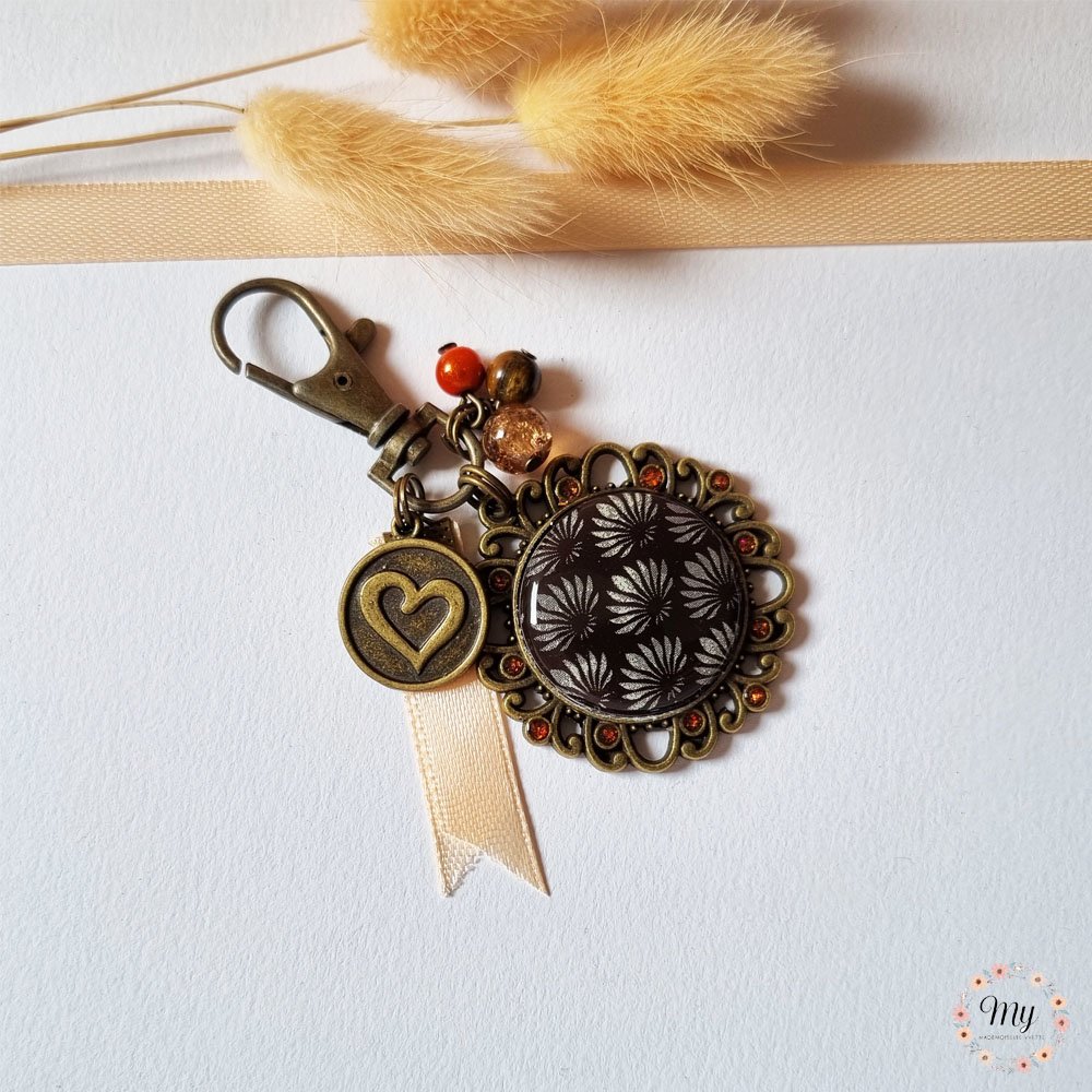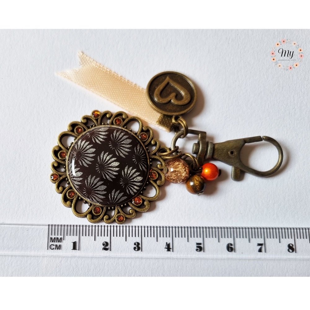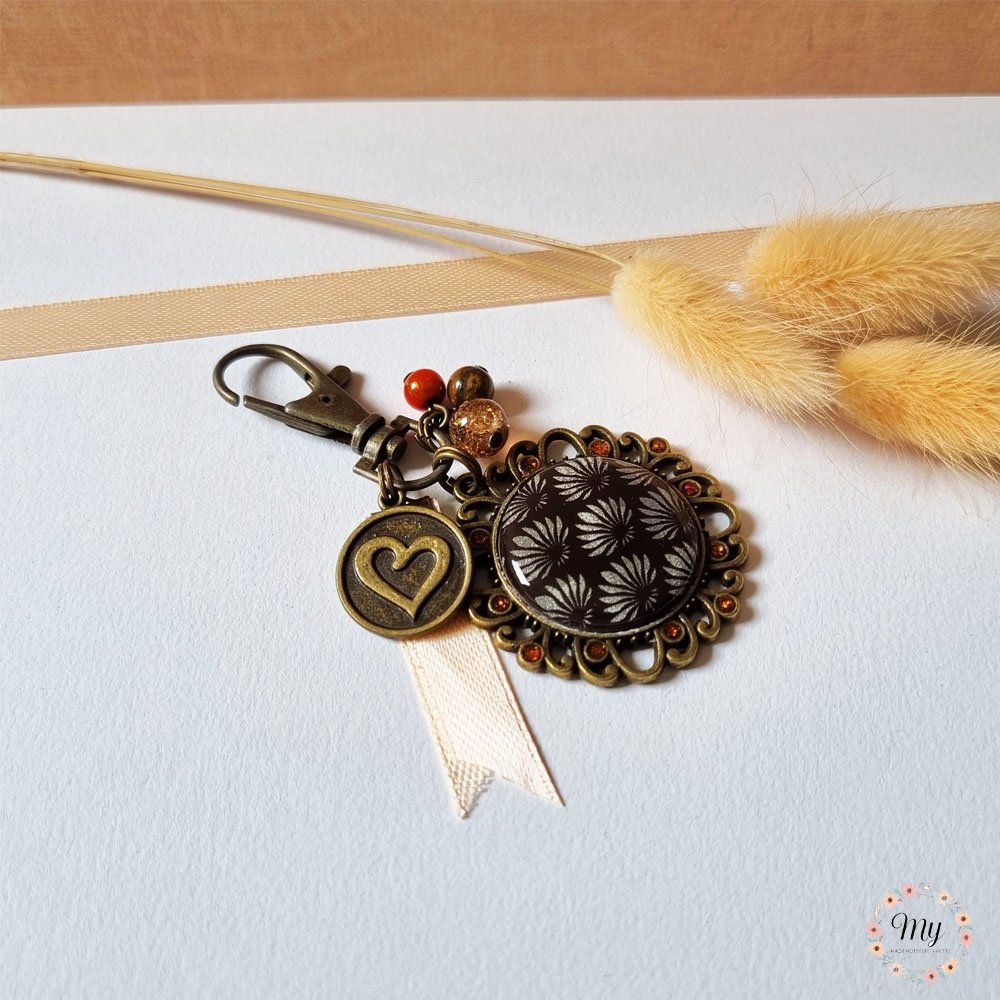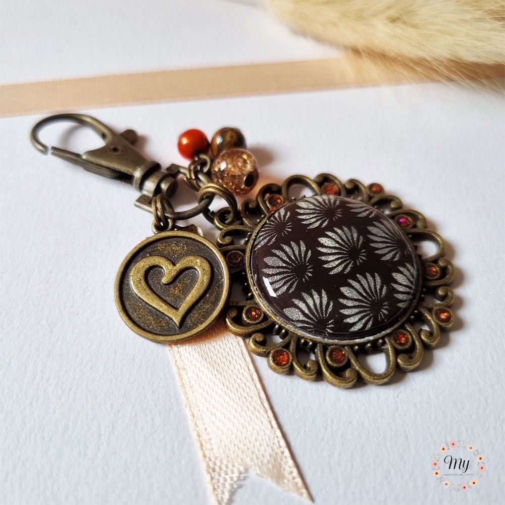 Porte clés , bijou de sac "fleurs d'automne" marron foncé