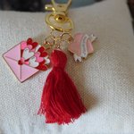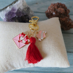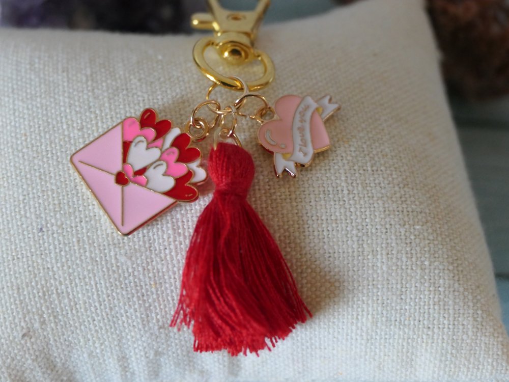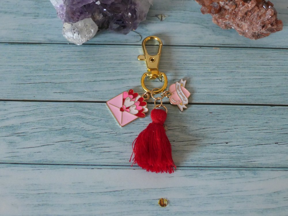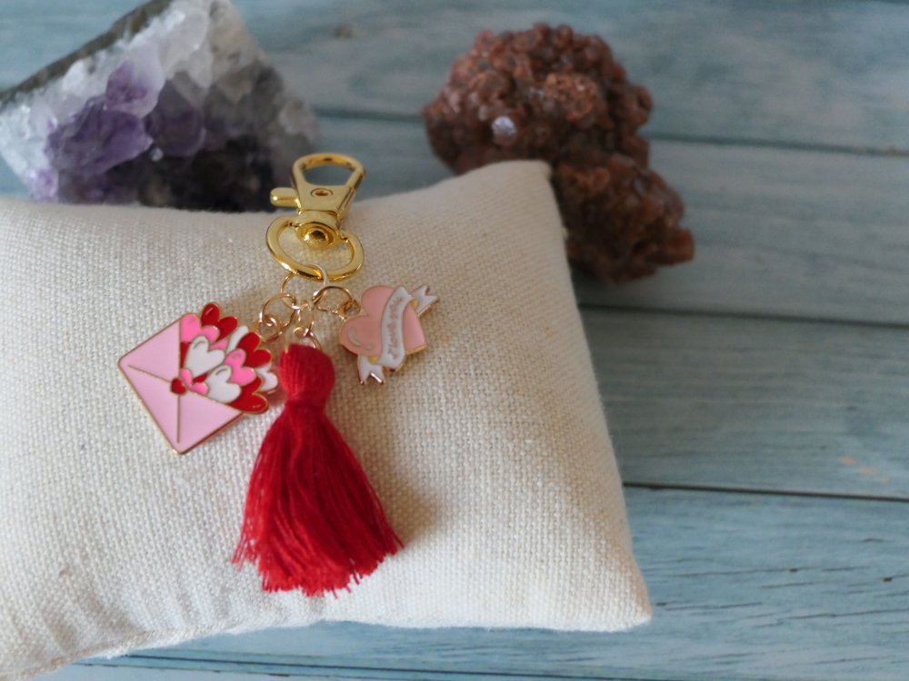 Apporter à votre une touche unique à votre sac avec se bijou composé d'un pompon rouge et de 2 breloques cœur avec inscription "i love you" et enveloppe distribuant des cœurs.