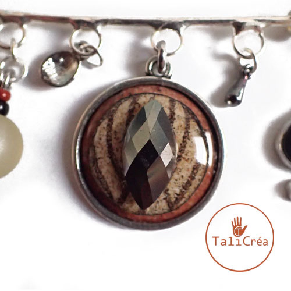Avec cabochon de sables marron, jaunes, rouges et strass noir à facettes.