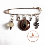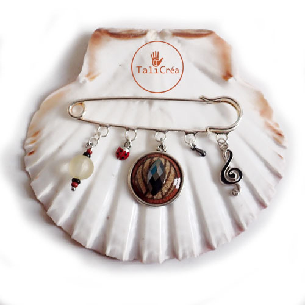Une épingle à nourrice en alliage couleur argentée avec breloques coccinelle, goutte gun métal, clef de sol, perle jaune.