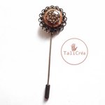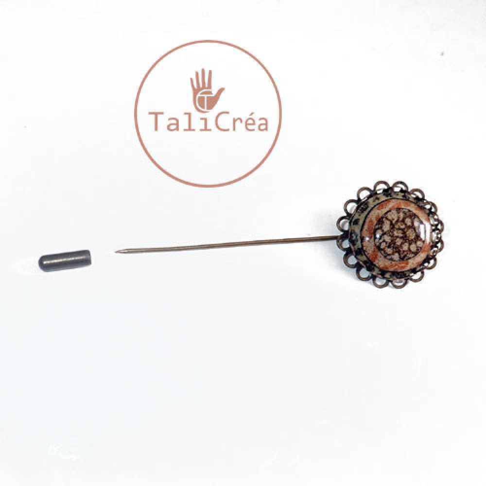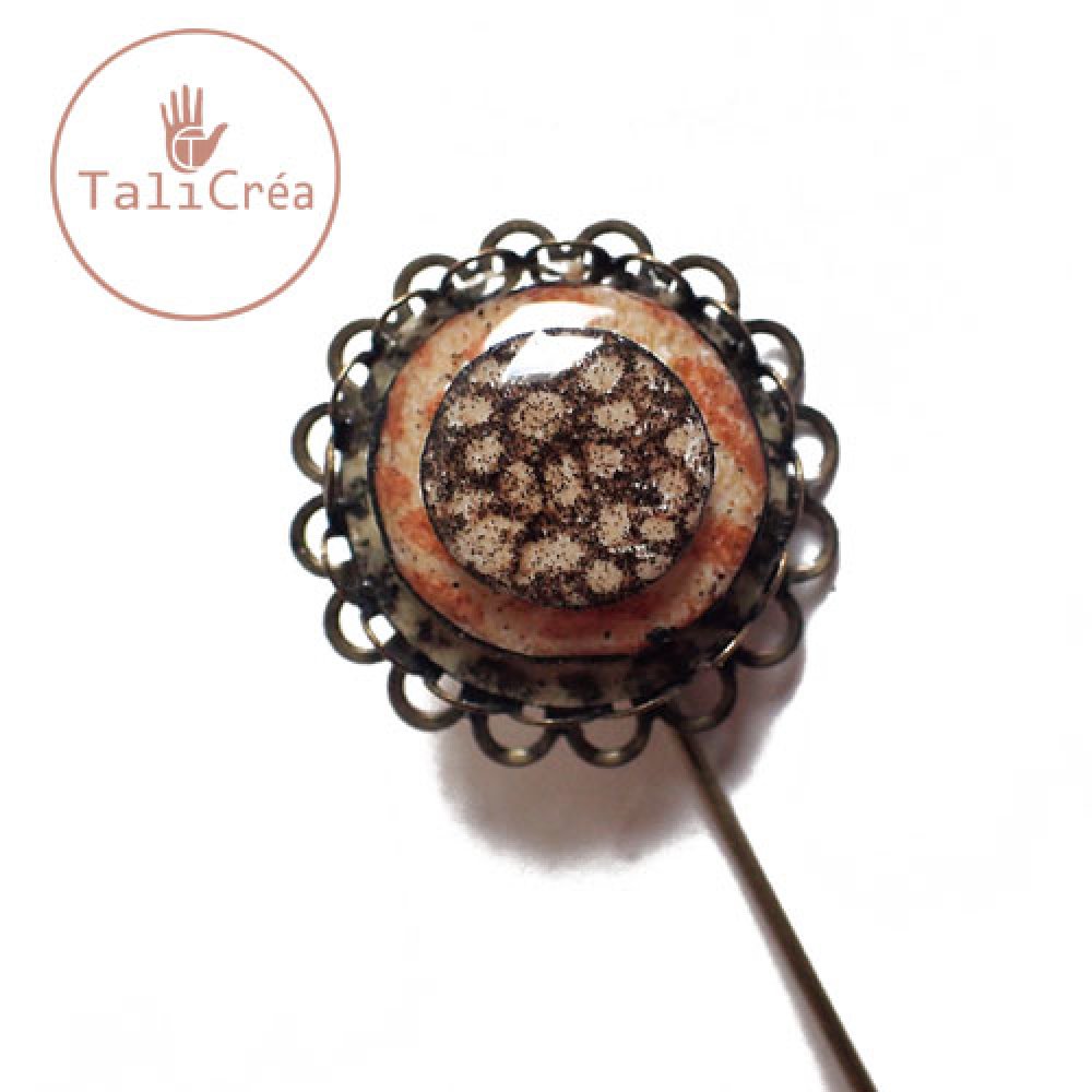 Une fibule en forme de fleur, en métal couleur bronze, avec des cabochons de sables jaunes marron orange, noirs et blancs..