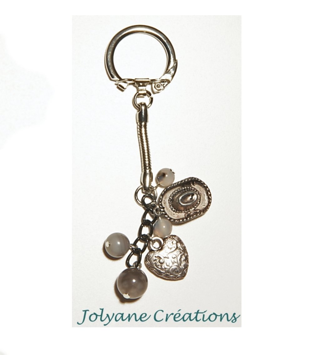 Il est composé d'une attache de belle qualité en métal argenté, d'un cœur et d'un chapeau de cowboy en métal argenté vieilli et de 4 perles en agate du Botswana.