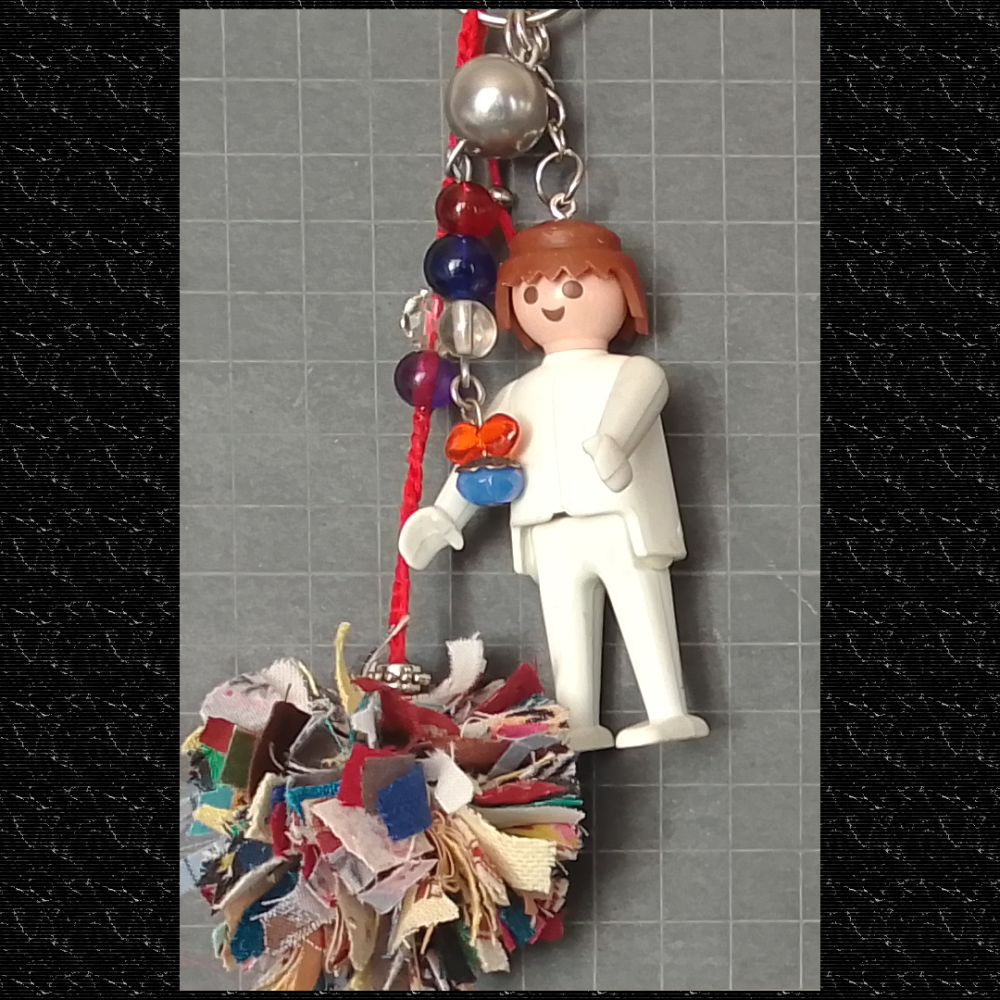 Créé avec une figurine Playmobil vintage, des breloques et des perles récupérées, cet accessoire offre une seconde vie à des objets oubliés grâce à l'upcycling.