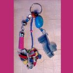Porte-clé/bijou de sac unique Moi Je Recycle. Créé en France par upcycling de figurine vintage, breloques et perles récupérées, plus un pompon en chutes de tissu.