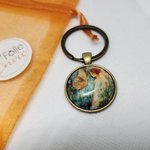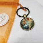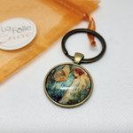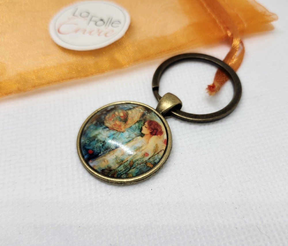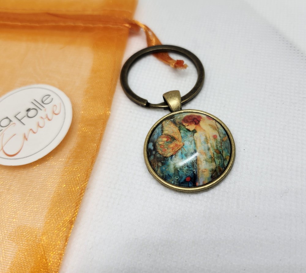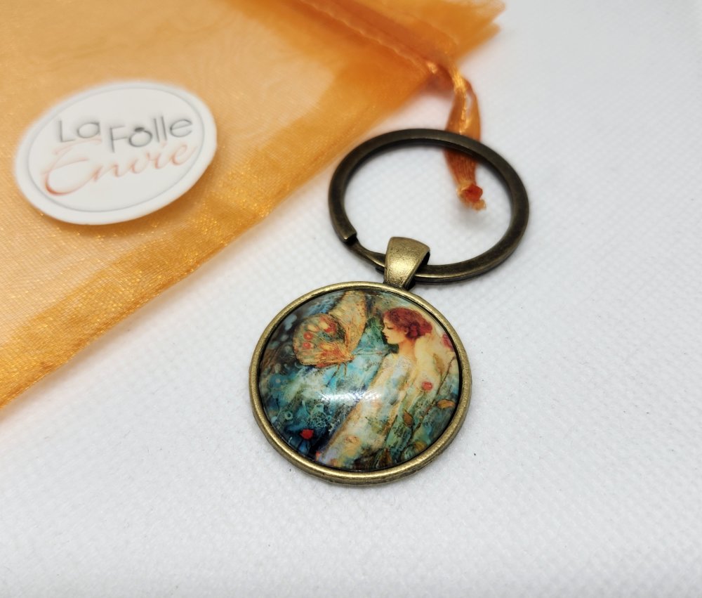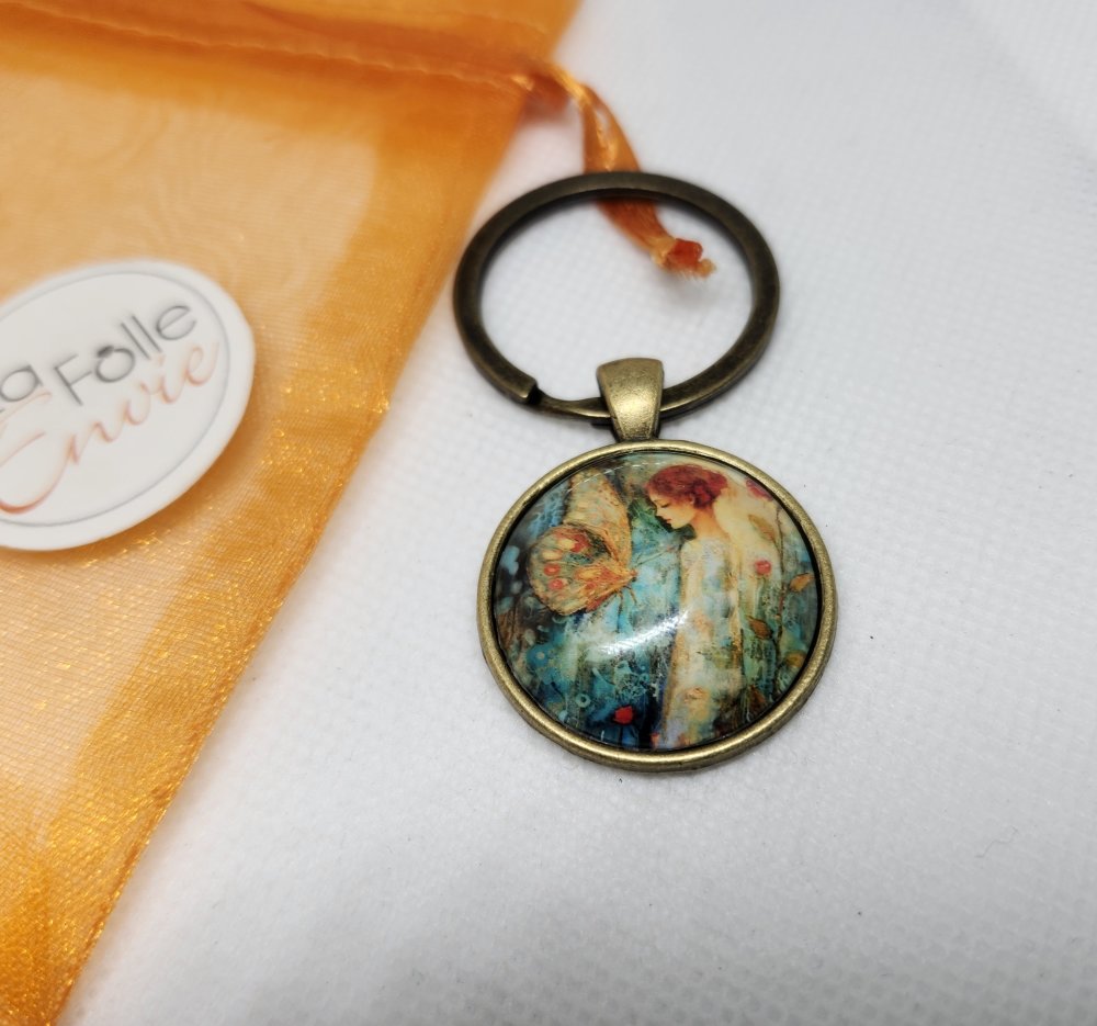 Je vous propose une de mes créations. Joli porte-clé en métal couleur bronze et cabochon en verre 25mm. Motif jeune fille au papillon. PIÈCE UNIQUE.