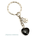 Porte-clé porte-bonheur avec une perle en forme de cœur en Onyx noir véritable et une breloque trèfle à quatre feuilles en relief sur les deux faces