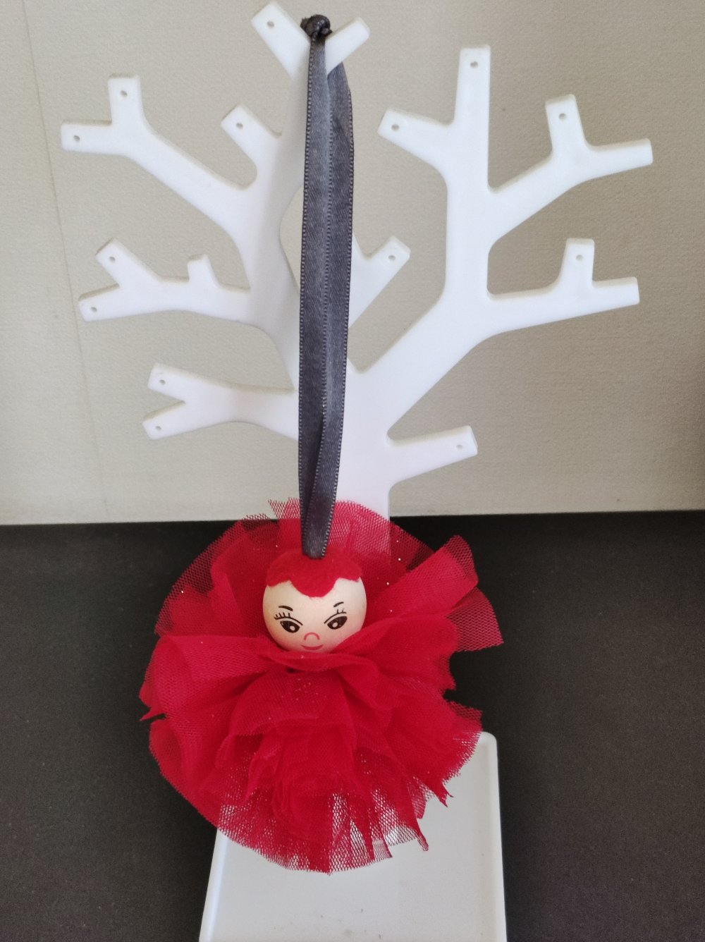 Tête de poupée bois avec sa petite jupe en tulle rouge