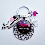 Porte-clef bijou de sac argenté composé d'un cabochon " SUPER INFIRMIÈRE ", de breloques seringue, masque, fleur, coeur et perles assortis.
