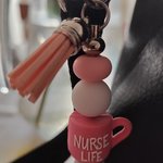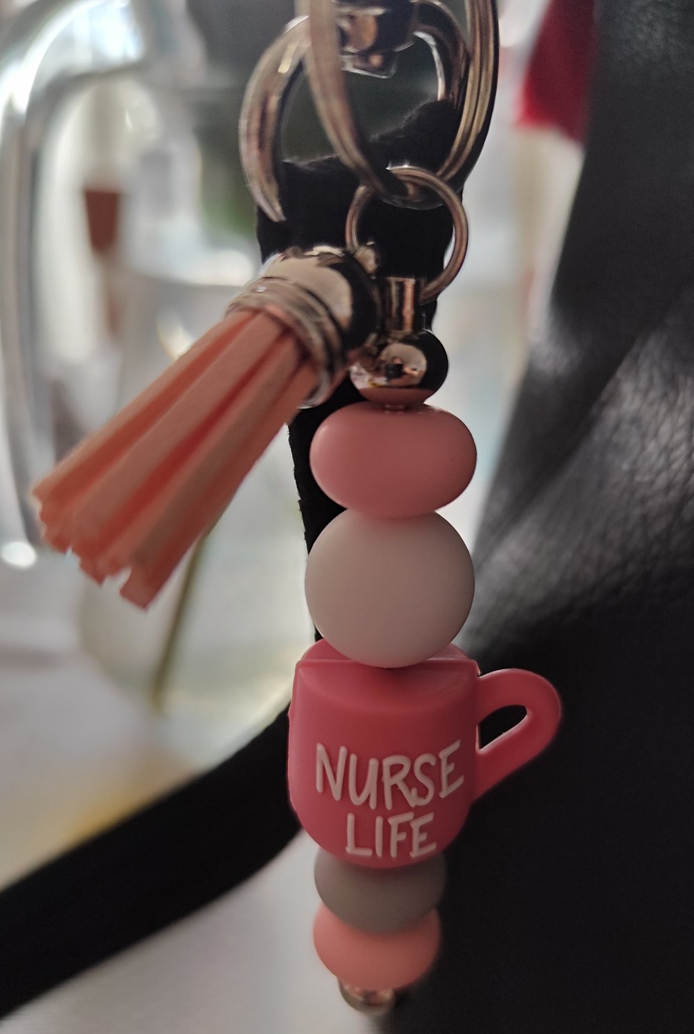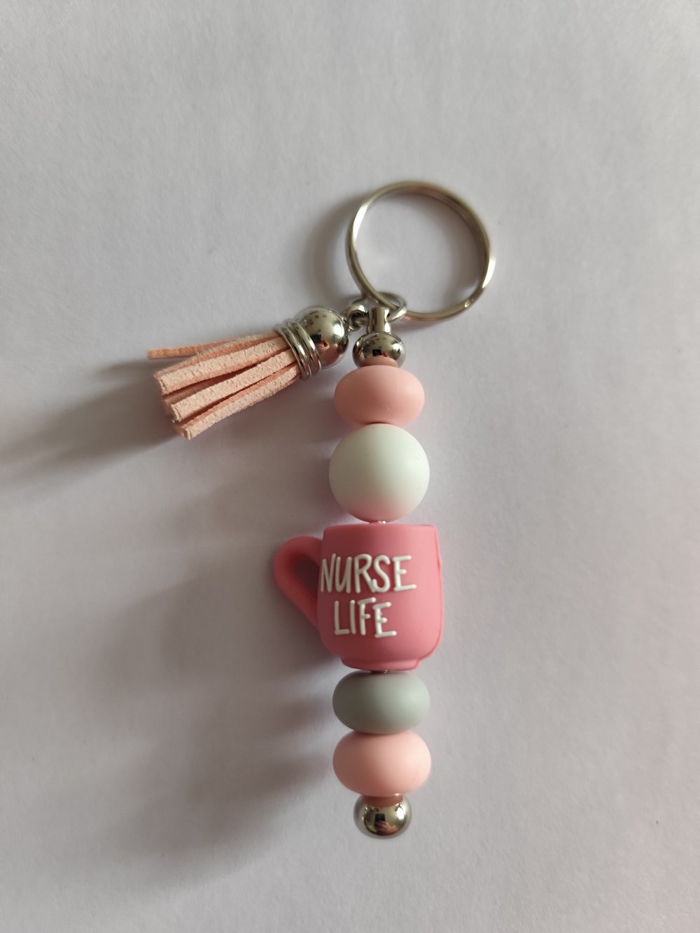 Porte clefs tige réaliser avec une perle en silicones de couleur blanc et trois perles plates de couleurs gris et rose. Perles en forme de mug couleur rose avec inscription " Nurse Life " .