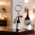 Porte-clés artisanal avec bouteille, verre à moitié rempli et tire-bouchon.