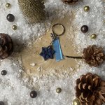 Porte-clés décoré de rubans en satin bleus et organza argentés, d'un grelot argenté et d'une étoile réalisé en pate polymère