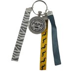 Un ruban jaune motifs moustaches, un ruban gris et un ruban zébré gris et blanc